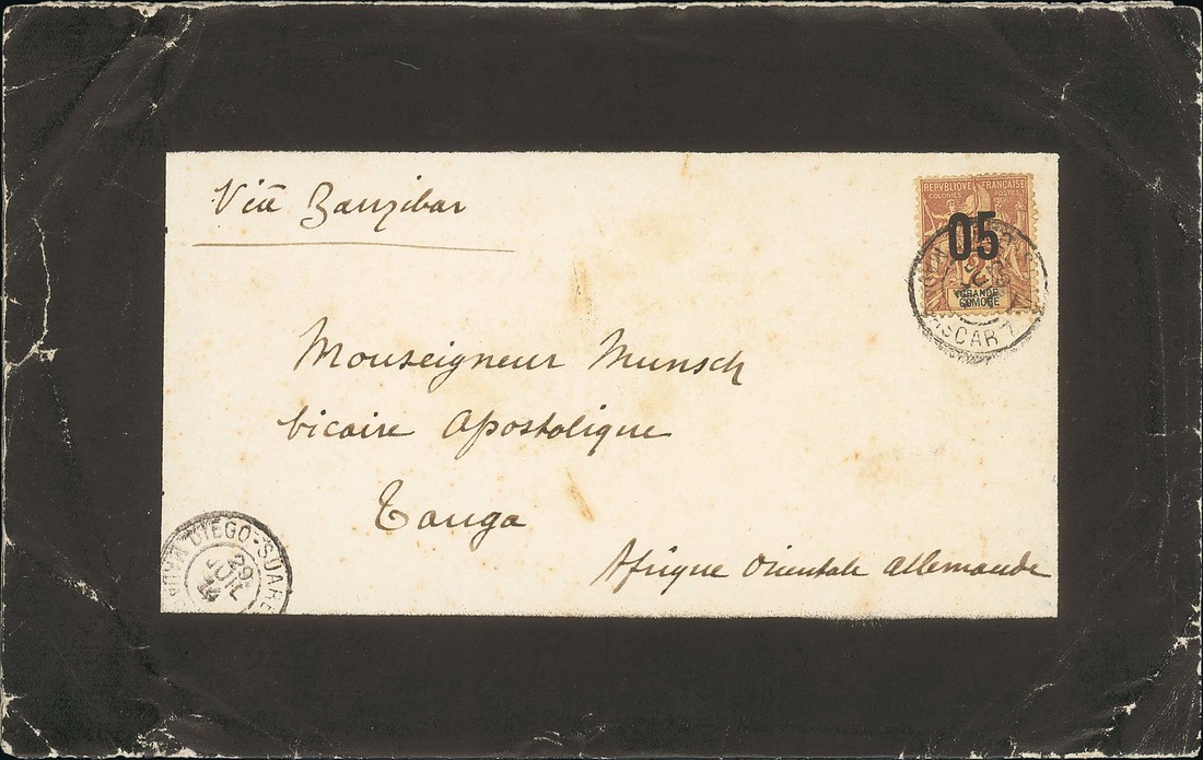 1914 (29 July) large mourning envelope to Tanga franked Comoro Islands 1912 "05" on 2c. tied by Diego-Suarez/Madagascar cancellation, Zanzibar transit on the reverse; some small perimeter faults but a rare Colonial Death notice