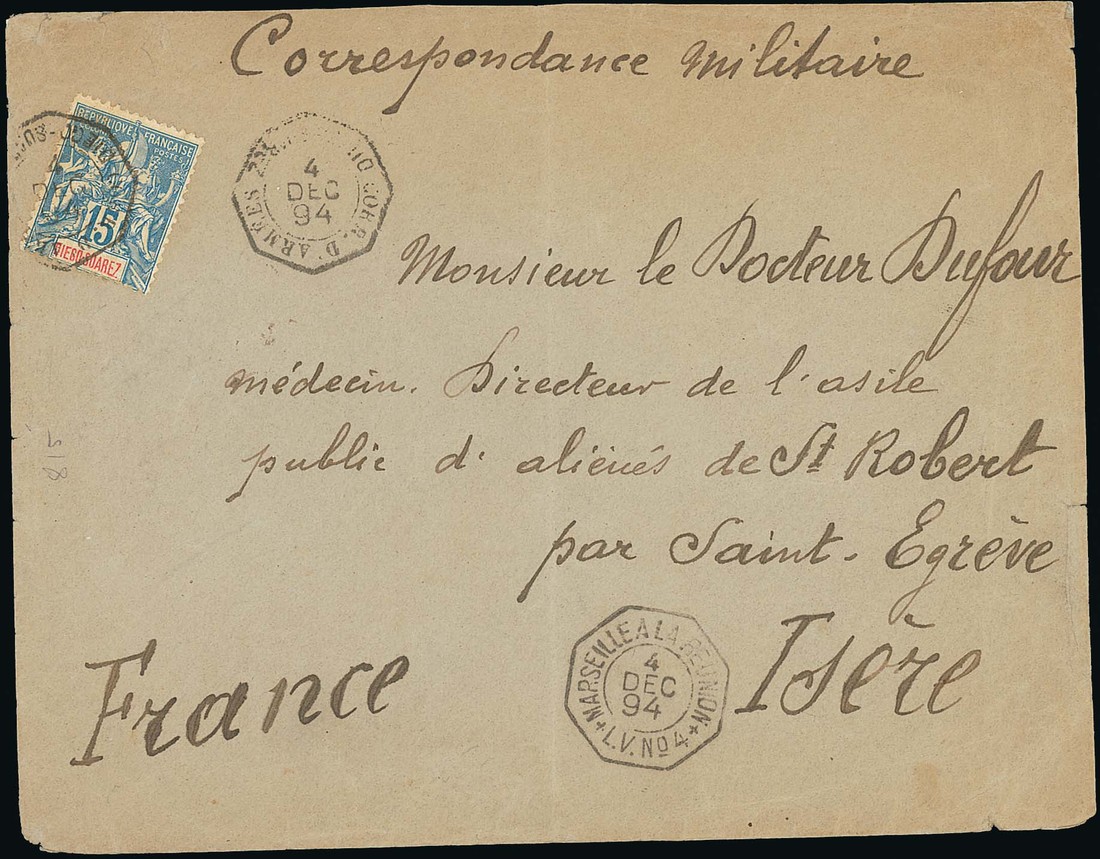 1894 (4 Dec.) envelope to Isere franked 15c. with octagonal Corr. D Armees/Diego Suarez cancellation, endorsed Correspondence militaire, octagonal Marseille a la Reunion/L.V. No. 4 below, Military cachet and arrival datestamp on reverse; vertical fold and a little crumpled at the corners. Scarce