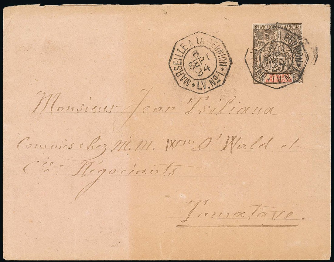 1894 (6 Sept.) 25c. postal stationery envelope to Tanatave, octagonal Marseille a la Reunion/LV No. 1 cancellation, posted at or on board the French packet Iraouaddy at Sainte Marie; very early use, fine and rare
