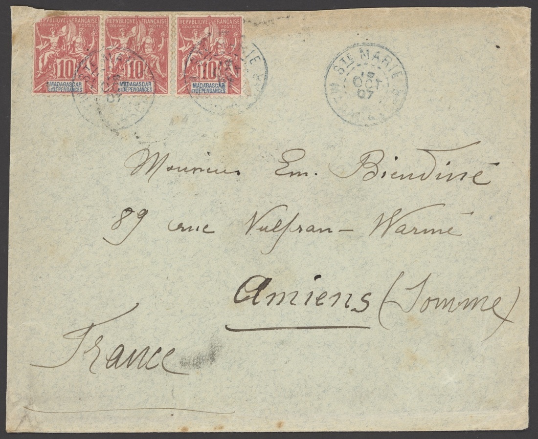 1896 (30 May) envelope registered to Tamatave franked 5c., 15c. and 30c., 1897 (19 July) 25c. postal stationery envelope to Montpellier, 1904 (5 April) envelope to Amiens franked 5c. (6), 1907 (15 Oct.) envelope to Amiens franked 10c. strip of three; good to fine. Photo on our website