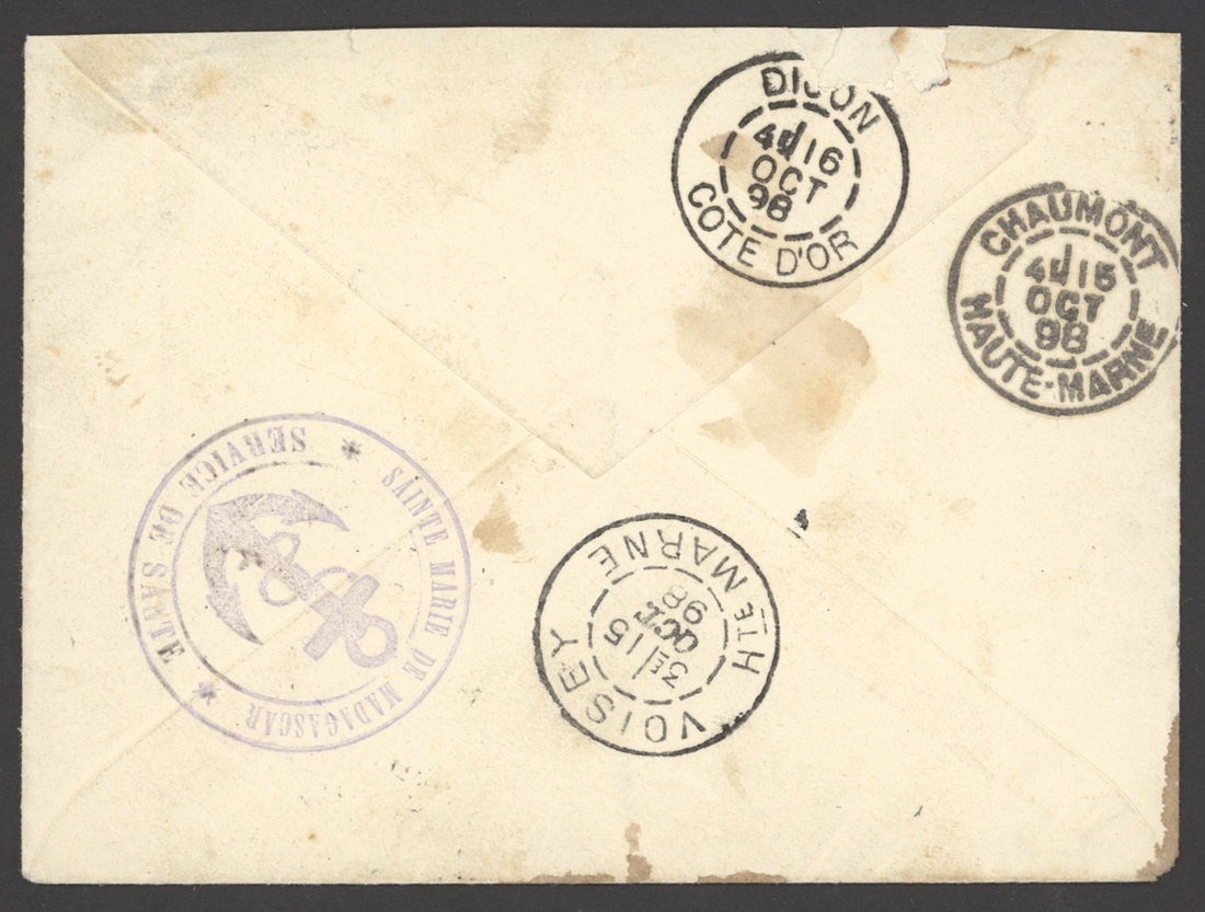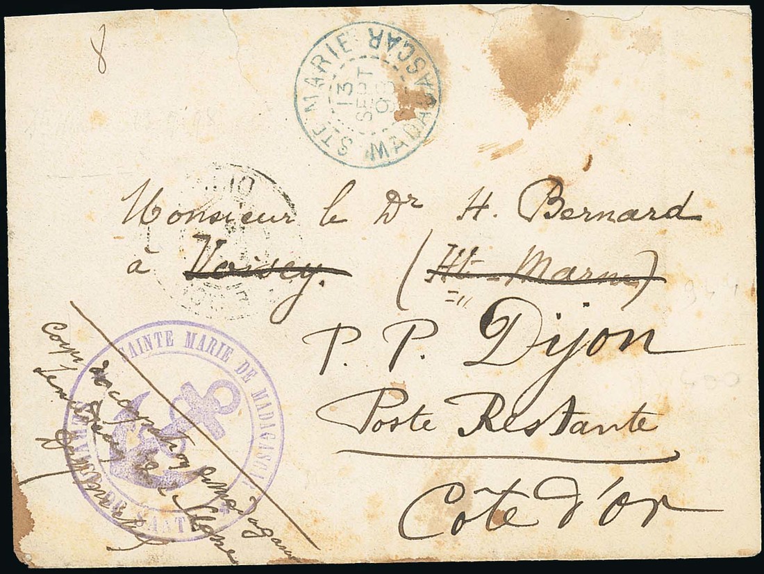 1898 (13 Sept.) stampless envelope to Dijon, Cote D'or, Algeria, with violet Health Service cachet and blue Ste. Marie/Madagascar datestamp; some perimeter faults and stains but rare