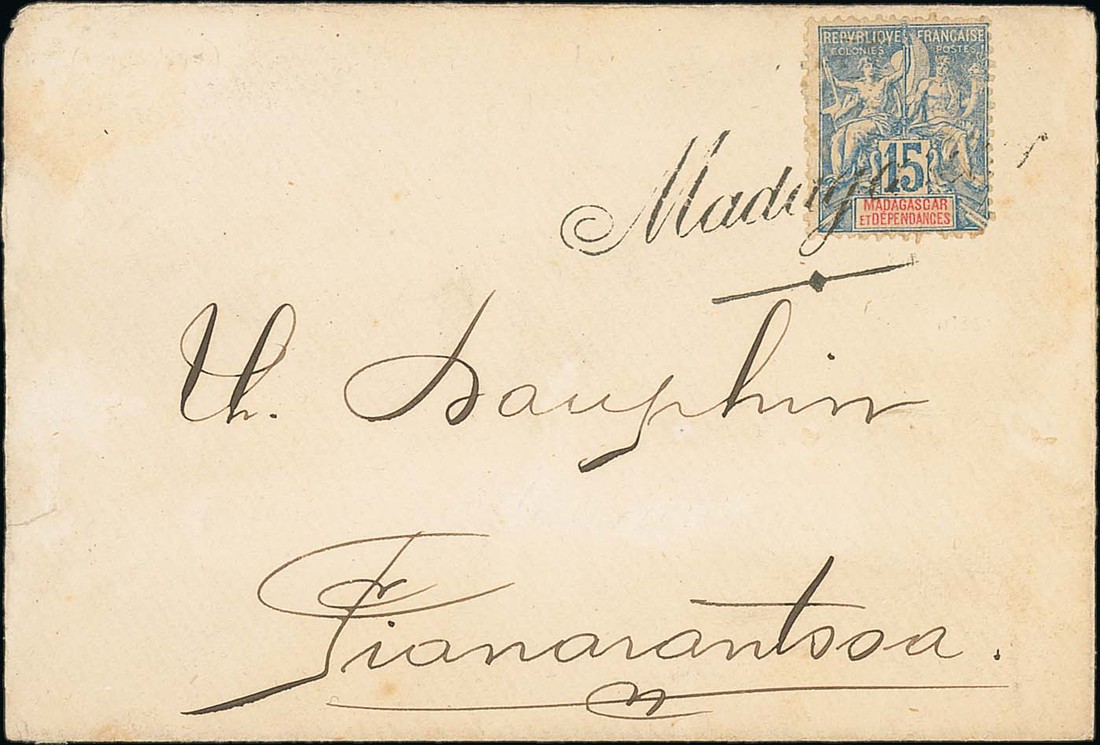 1896 (c.) envelope to Fianarantsoa franked 15c. with script Madagascar cancellation of the Mananjary Telegraph office; the adhesive and envelope both with small faults but very fine and most attractive appearance