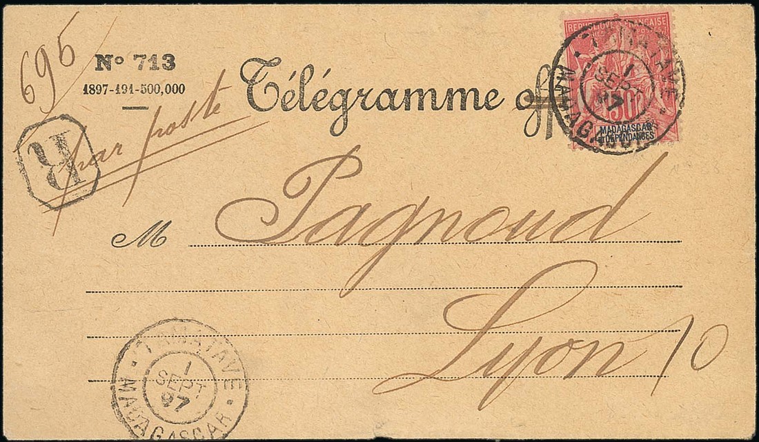1897 (1 Sept.) Telegramme to Lyon franked 50c. with Tanatave/Madagascar cancellation; fine and rare
