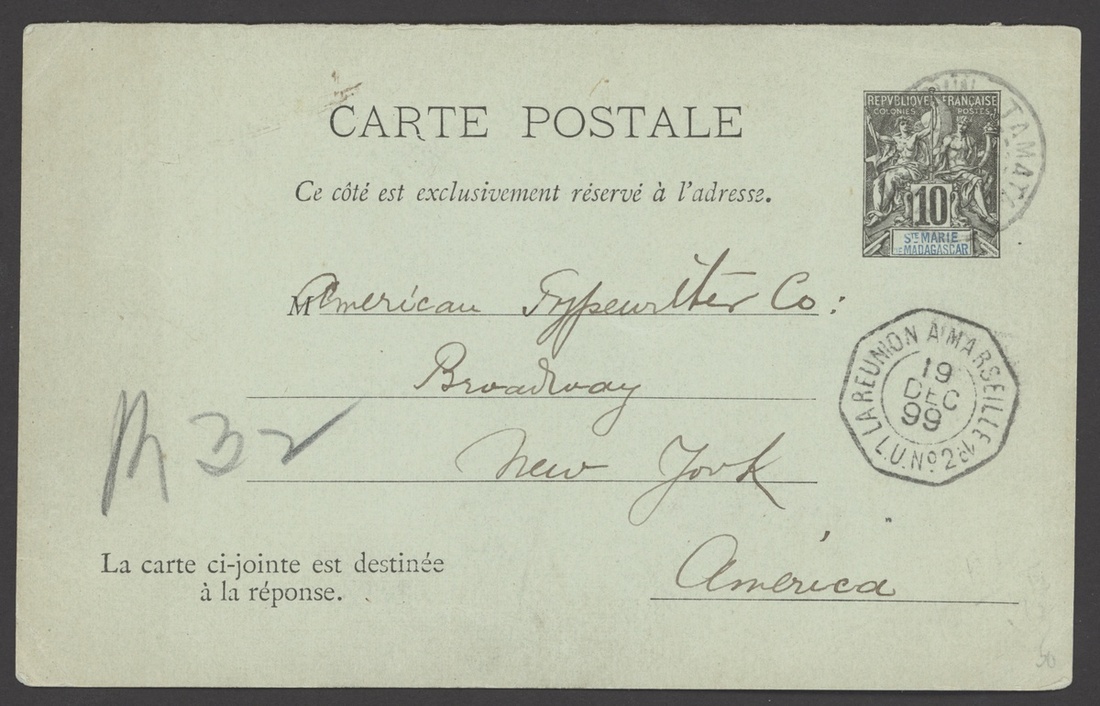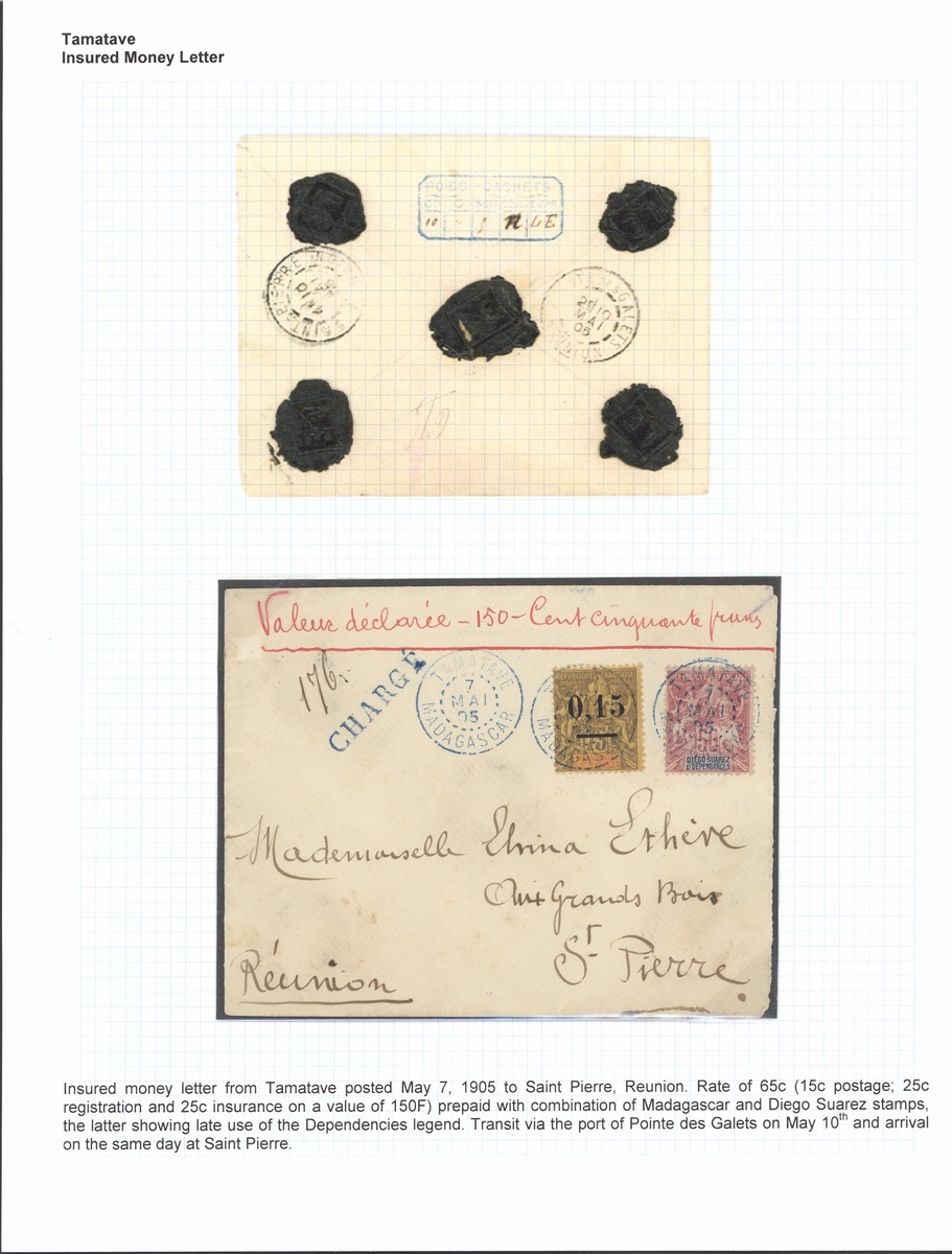 1898-1914 selection of seven covers or cards, including 1899 St. Marie de Madagascar 10c. postal stationery card to New York, 1905 Valuer Declaree envelope to St. Pierre franked 50c., 1902 "0.15" on 75c., 1910 10c. postal stationery letter card to Dar-es-Salam, etc., blue or black Tamatave/Madagascar cancellations; good to fine. Photo on our website