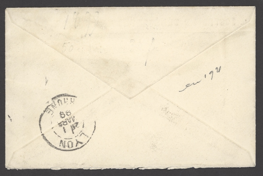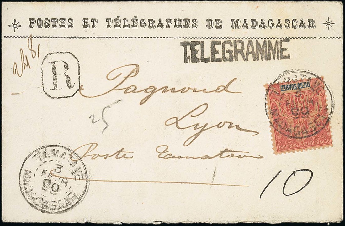 1899 (3 Feb.) Telegramme envelope to Lyon franked 50c. with Tamatave/Madagascar cancellation, arrival datestamp on reverse; fine and scarce
