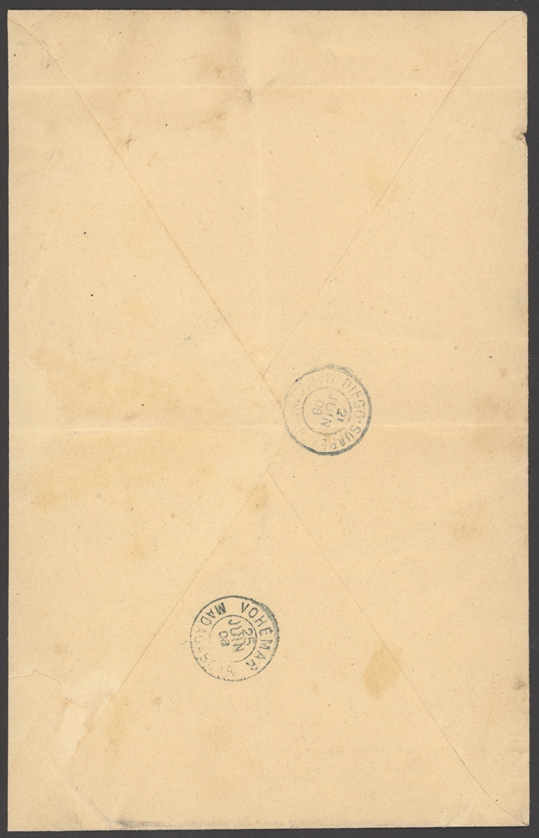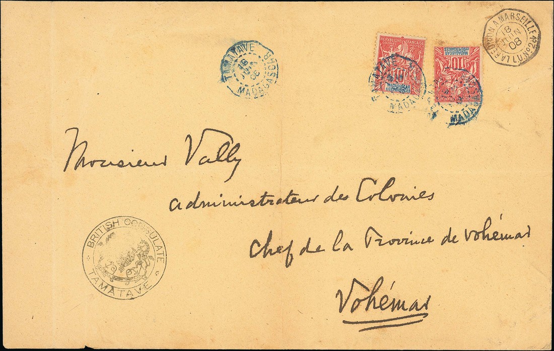 1908 (16 June) envelope to Vohemar, franked 10c. (2) with blue Tamatave/Madagascar cancellations, British Consulate Tamatave cachet, octagonal La Reunion a Marseille/L.U. No. 2 datestamp, transit and arrival markings on reverse; two vertical folds, a fine double weight letter