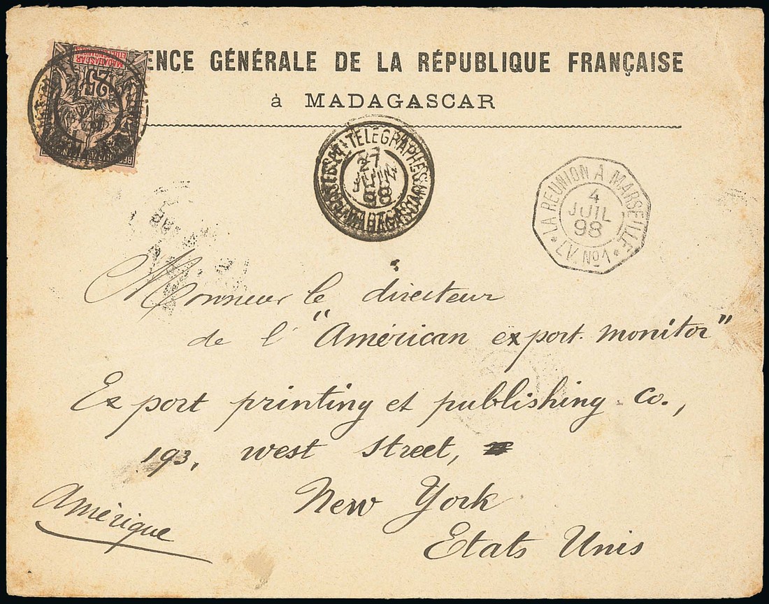 1898 (27 June) envelope to New York franked 25c. with Postes et Telegraphes/Madagascar cancellation, octagonal La Reunion a Marseille/LV. No. 1 alongside, transit datestamp on reverse; the envelope a trifle crumpled around the edges but fine and believed to be the only recorded use of the Telegraphic cancellation on group type issues