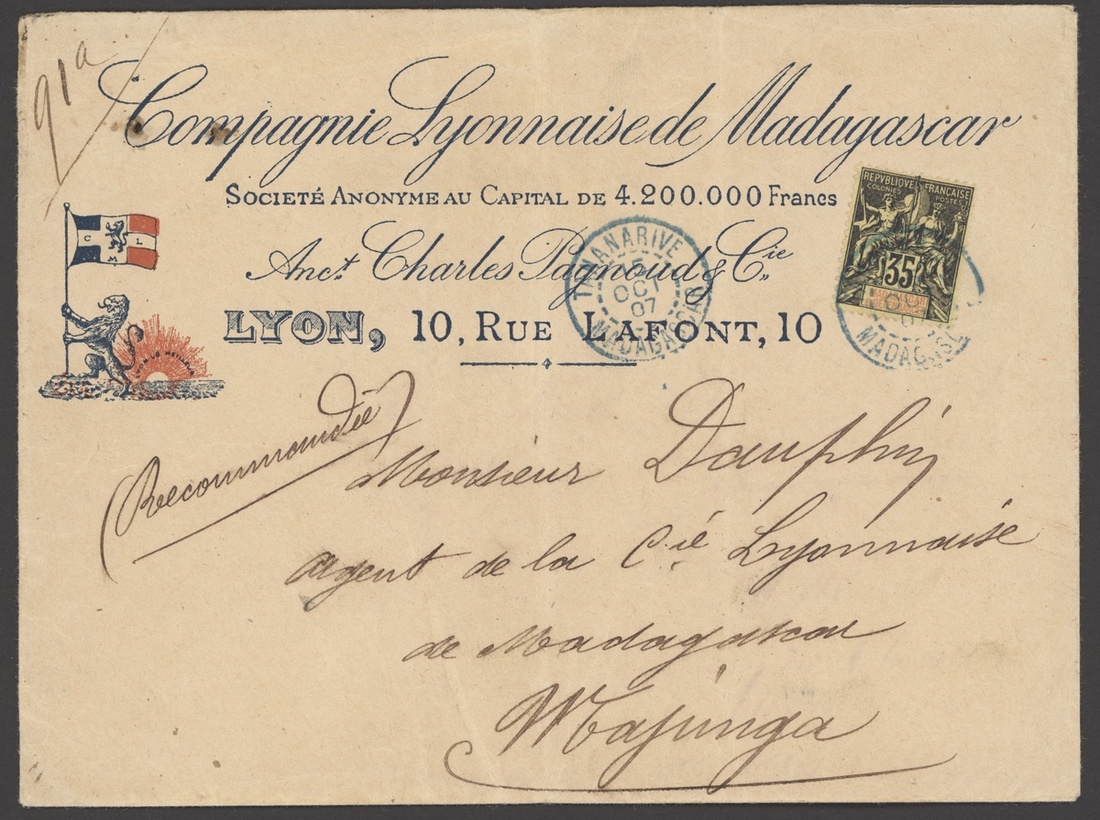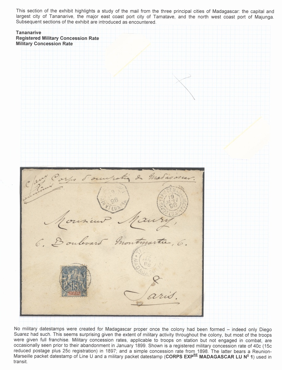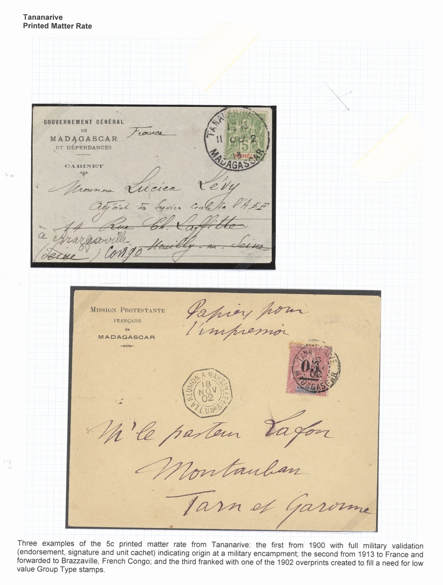 1898 envelope to Paris endorsed Corps d'Occupation du Madagascar franked 15c. with Corps Expre Madagascar Lu No. 1 cancellation, 1900 envelope to Brazzaville franked 5c. with large Tananarive/Madagascar cancellation, 1902 cover to France franked 1902 "05" on 50c., 1907 advertising envelope franked 35c., 1912 cover franked Grand Comoro "05" on 4c., sent at the printed matter rate but taxed 10c., 1913 letter to Tamatave franked Grand Comoro "10" on 50c., 1914 Valuer declaré letter (100fr.) with an unusual combination of surcharged values to 75c., good to fine. Photo on our website