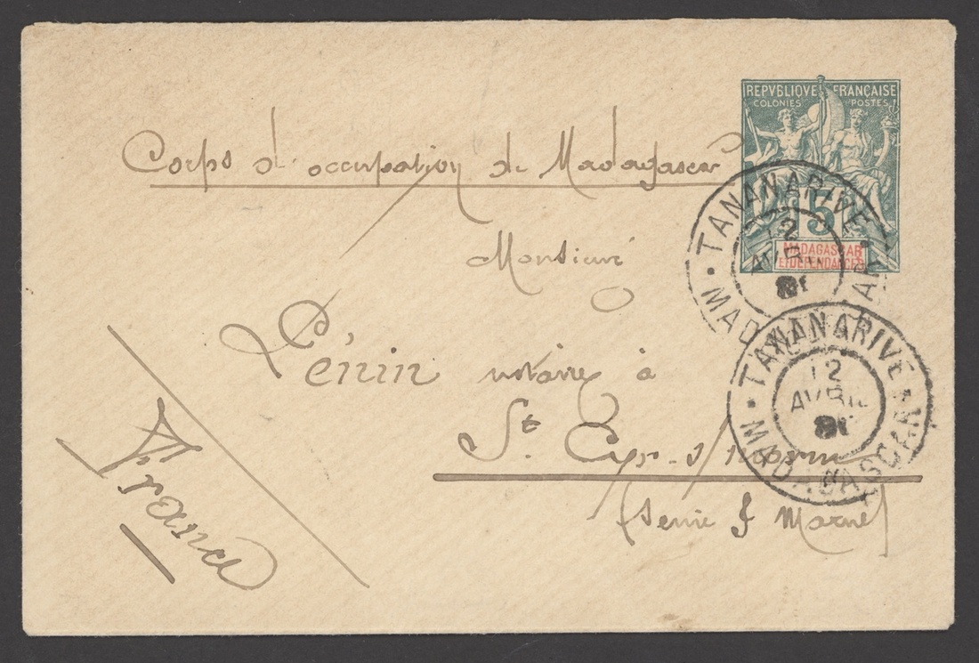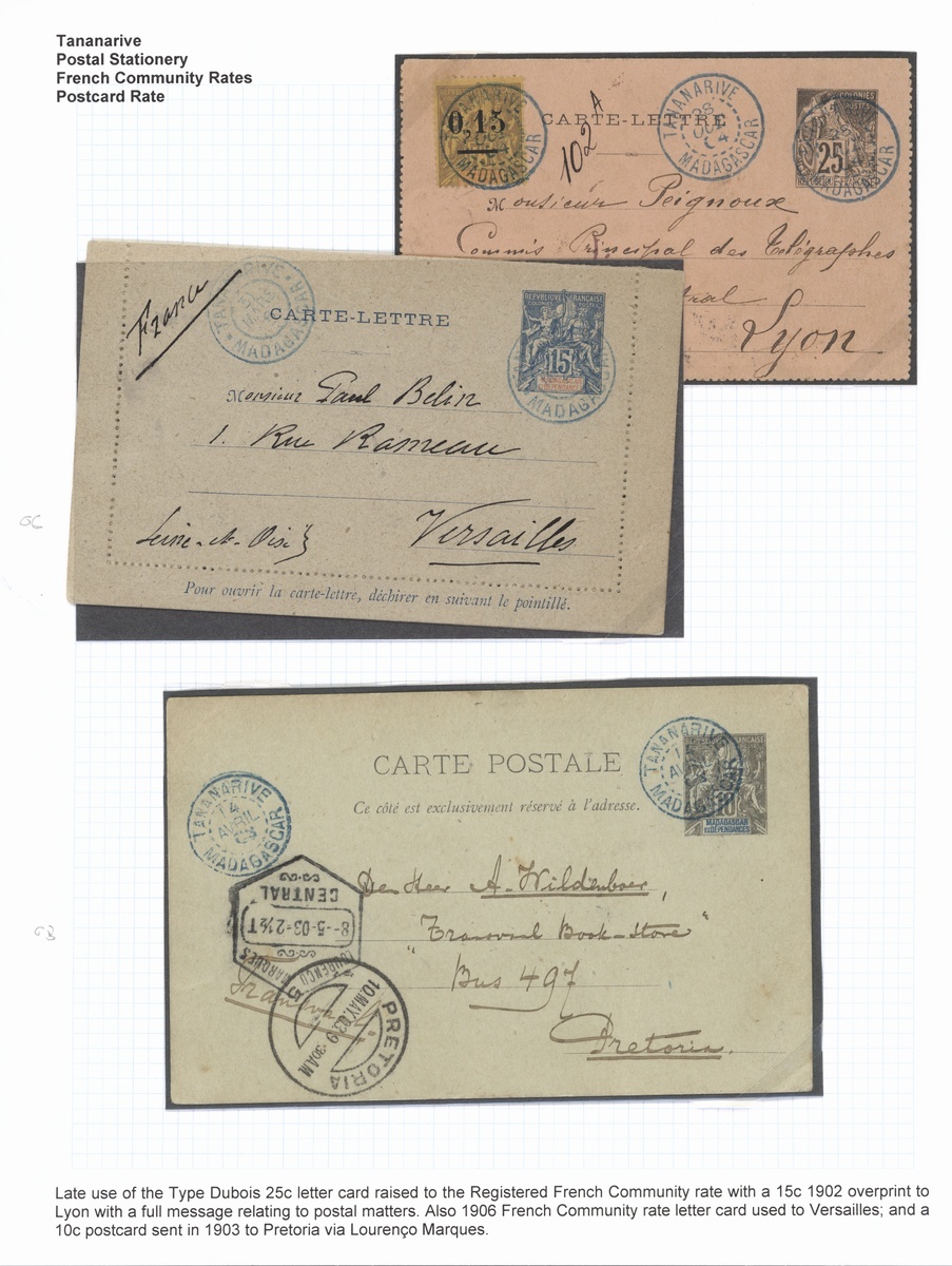 1900 5c. postal stationery envelope to France, 1903 10c. postal stationery card to Pretoria, 1904 Dubois 25c. postal stationery letter card to Lyon, additionally franked 1902 "0.15" on 75c., selvedge removed, 1906 15c. letter card used to Versailles (selvedge intact), all with Tananarive/Madagascar cancellations in blue or black; fine. Photo on our website