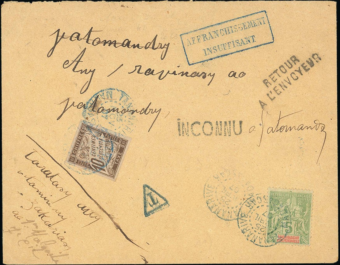 1907 (25 April) envelope to Vatomandry franked 5c. with blue dotted circle Tananarive/Madagascar cancellation, the addressee not known and with