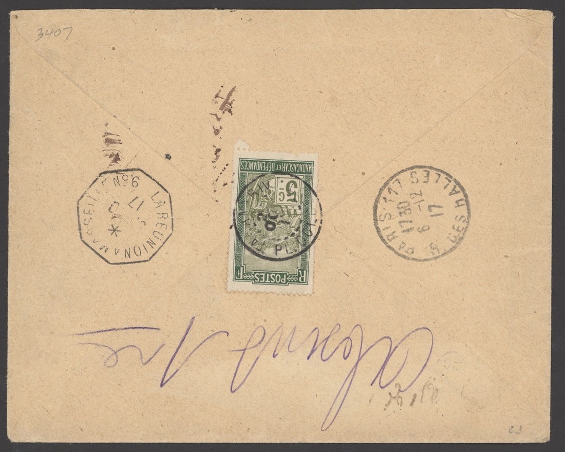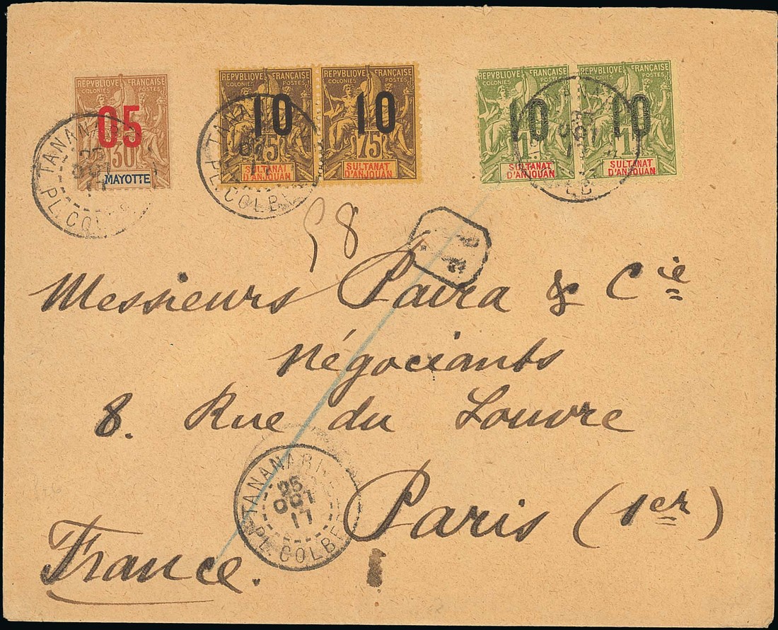 1917 (25 Oct.) envelope registered to Paris franked Mayotte "05" on 30c., Anjouan "10" on 75c. pair and "10" on 1f. (pair) on the front and 1908-17 Transport 5c. on the reverse, Tananarive/Colbert cancellations; fine and scarce and attractive mixed franking
