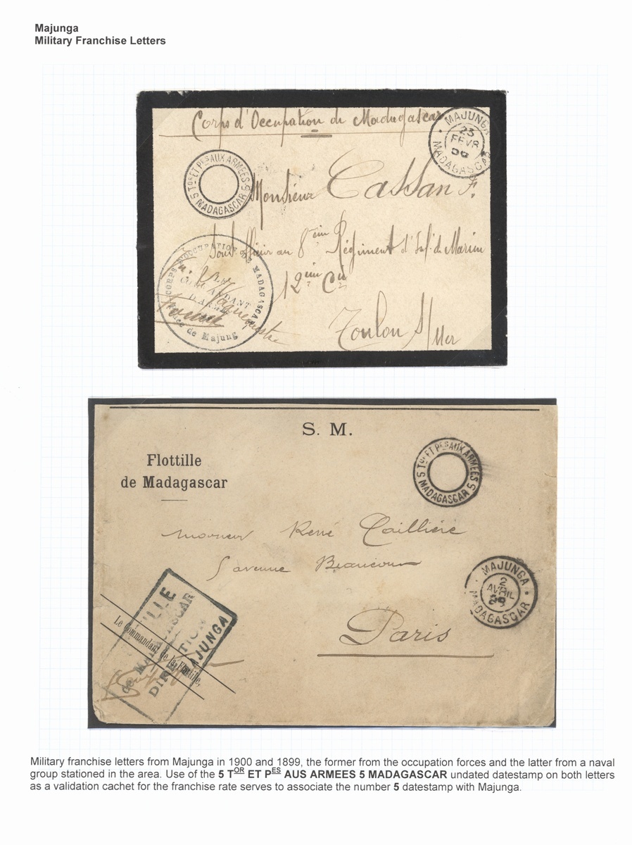 1899 (2 April) and 1900 (23 Feb.) stampless envelopes to France with Majunga/Madagascar datestamps and "5
