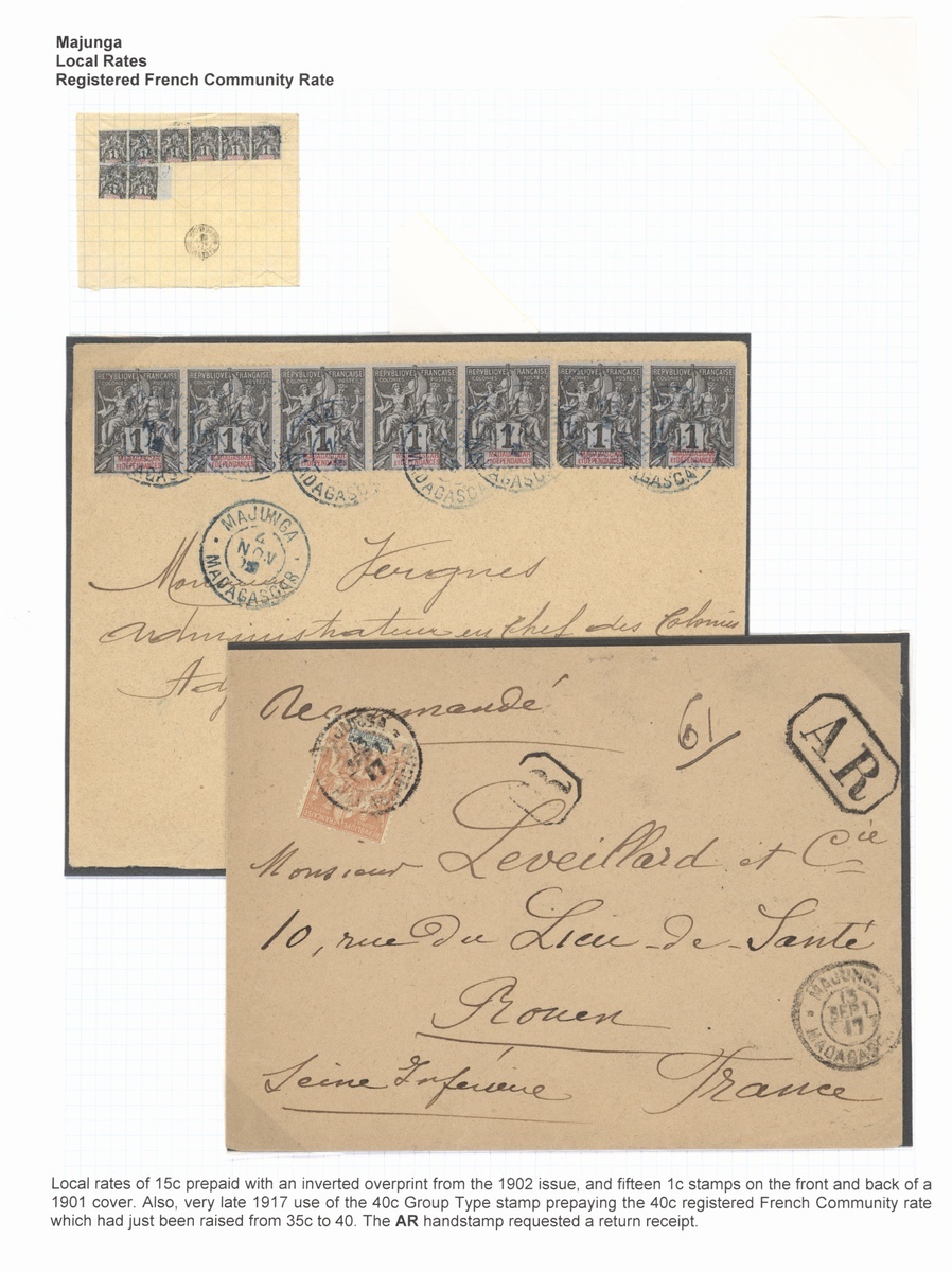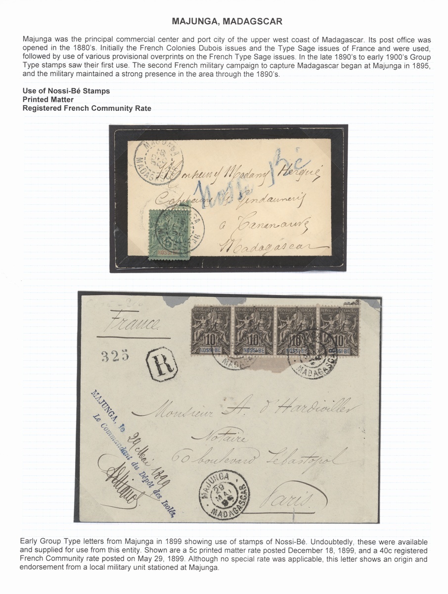 1899-1917 selection of six covers and a card, including 1899 (29 May) registered to Paris franked Nossi Be 10c. (4) with