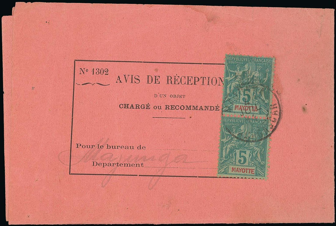 1914 (4 July), pink Avis de Réception form to Mandritsara franked Mayotte 5c. vertical pair, Majunga/Madagascar cancellation; fine and extremely rare