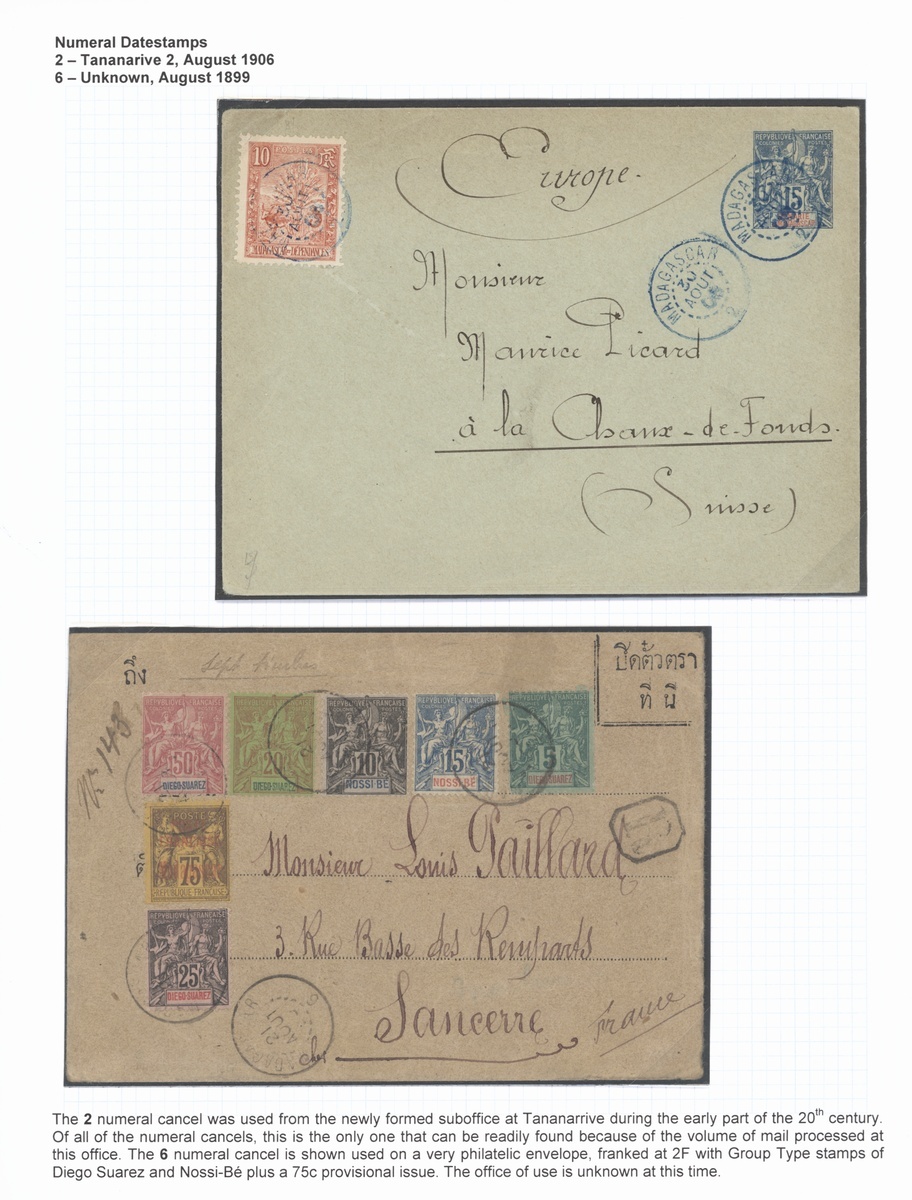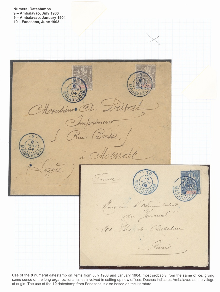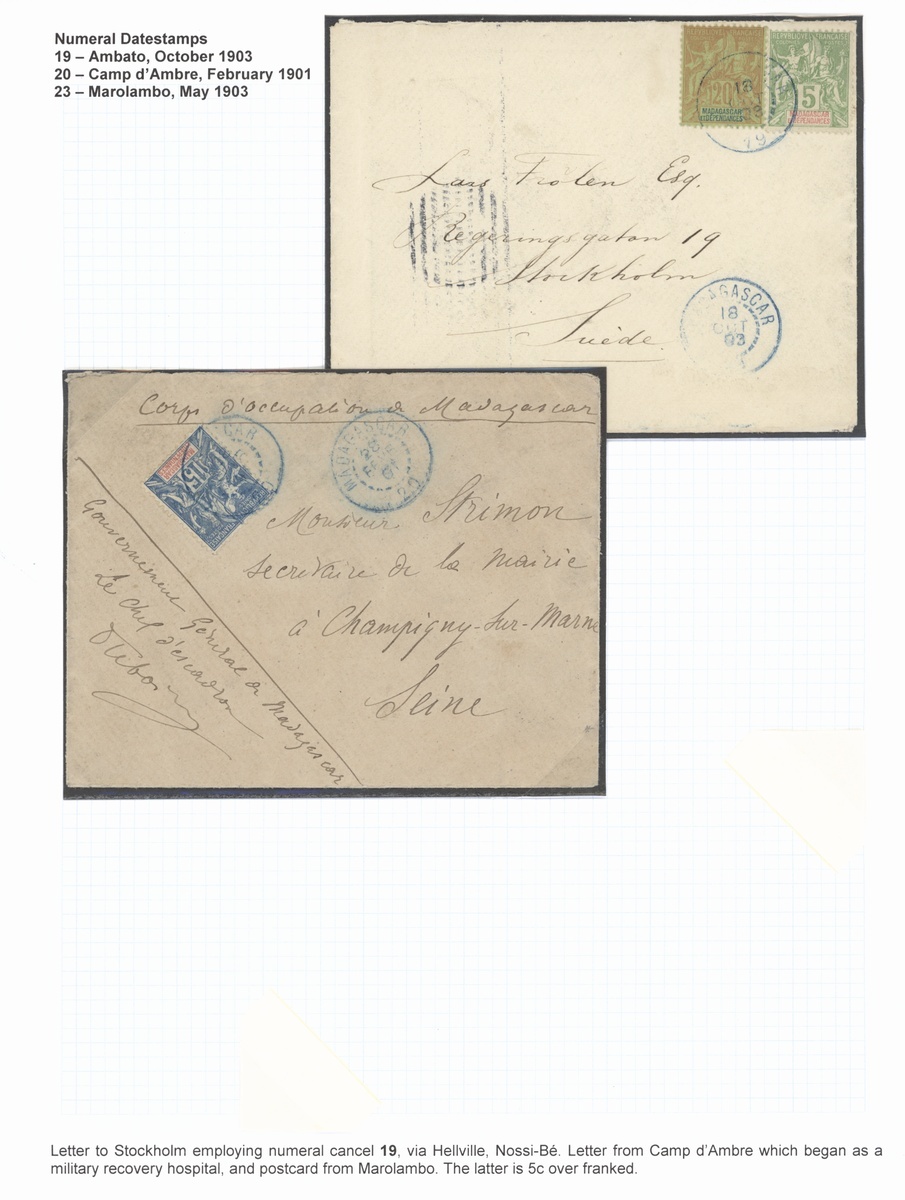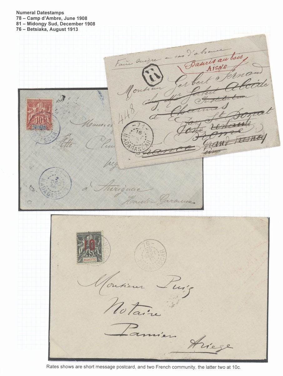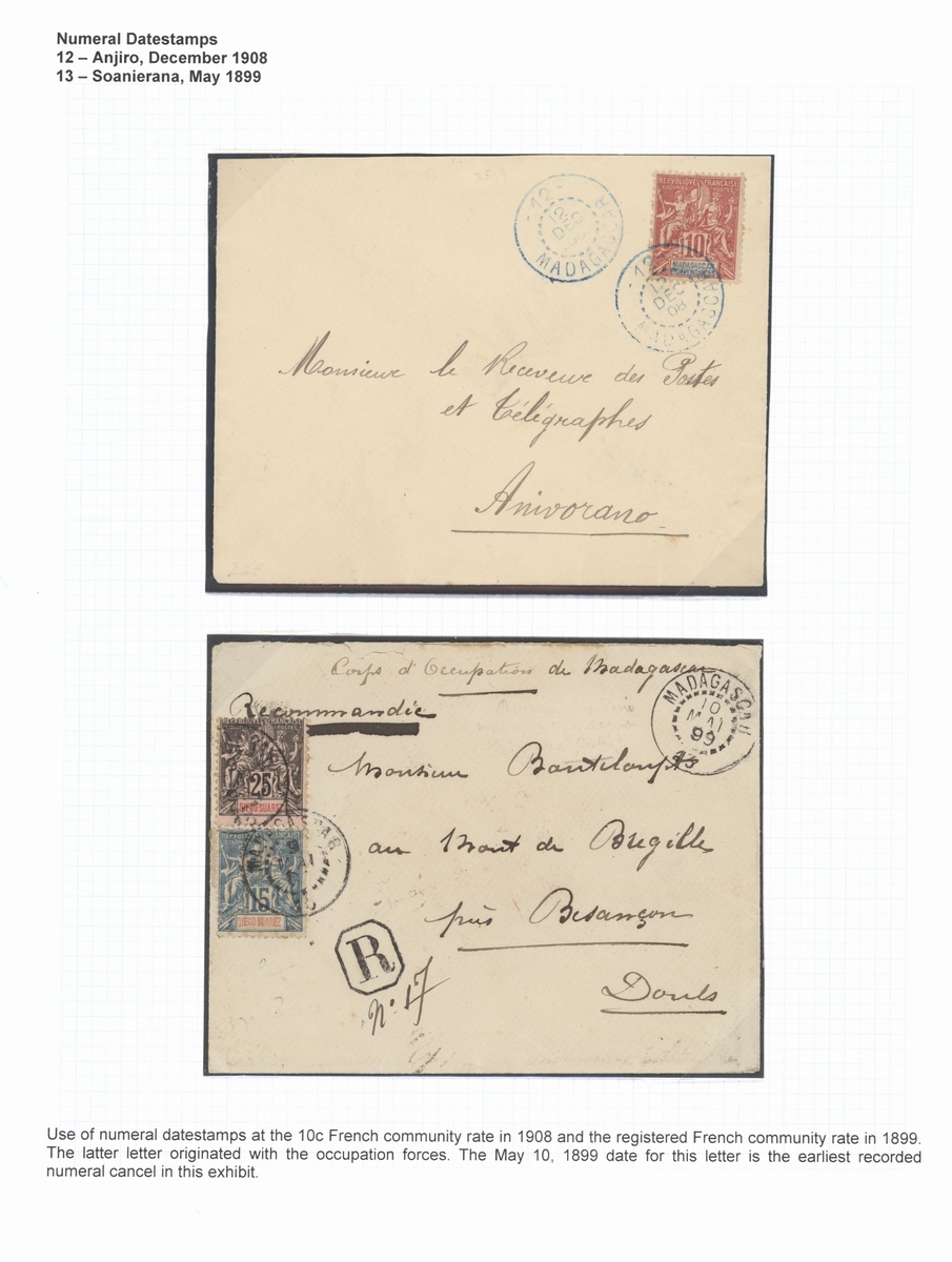 1899-1914 collection of seventeen covers, cancellations with "2" of Tananarive, "6" (location unknown), "9" of Ambalavao, "10" of Fanasana, "11" of Sakeleony, "12" of Anjiro, "13" of Soanierana, "19" of Ambato, "20" of Camp d'Ambre, "30" of Befotaka, "34" of Infandana, "42" of Ambatofindrahana, "48" of Mahatainjo, "49" of Kirboy, "71" (location unknown), "76" of Betsiaka, "81" of Midongy Sud, a variety of frankings and destinations, six registered; good to fine. Photo on our website