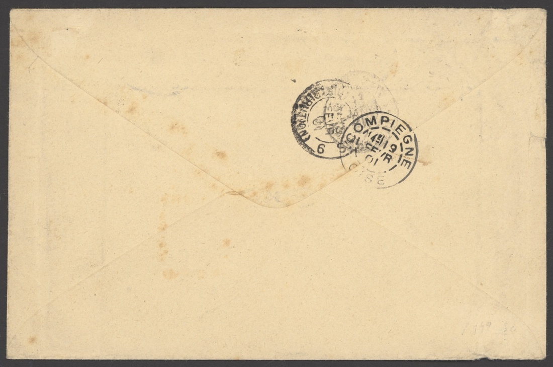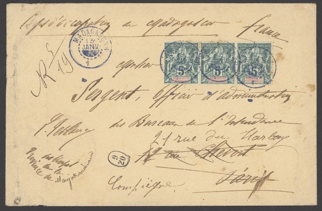 1901 (13 Jan.) envelope endorsed Corps d'occupation de Madagascar franked 5c. strip of three with blue Madagascar/1 cancellations without year date, Military cachet with Manjakandriana inserted by hand, transit and arrival markings on the reverse; small stain spots and a little crumpled. A scarce cover