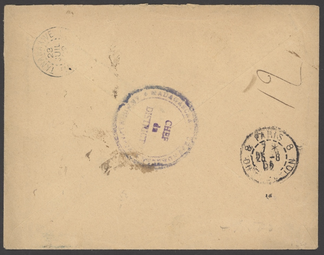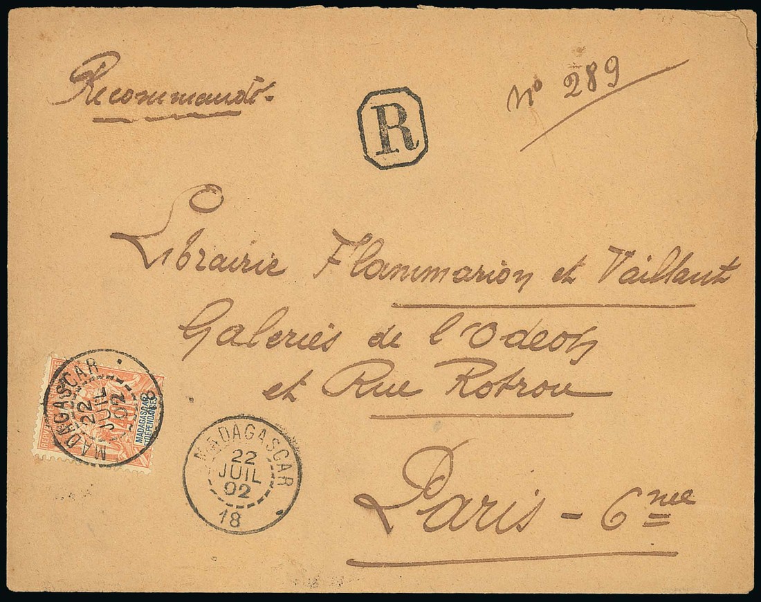 1902 envelope registered to Paris franked 40c. with Madagascar/18 cancellation of Amobohimasoa, Military cachet, transit and arrival markings of the reverse; fine