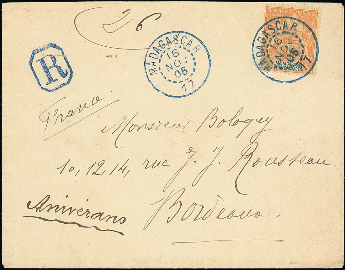 1905 (16 Nov.) envelope registered to Bordeaux franked 40c. with blue Madagascar/17 datestamp of Aninerano, transit and arrival datestamps on the reverse, fine