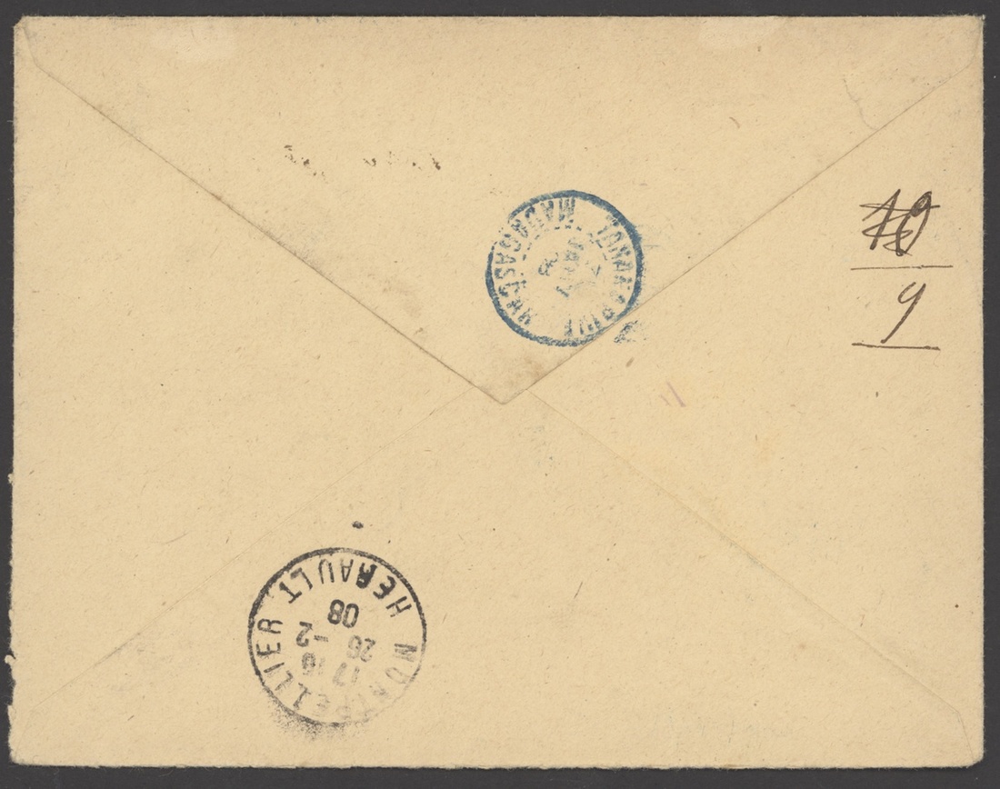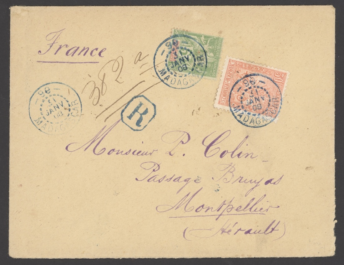 1908 (31 Jan.) envelope registered to Montpellier franked 5c., Zebu and Lemur 50c. with blue 99/Madagascar cancellations of Tananarive, transit and arrival markings on reverse; fine