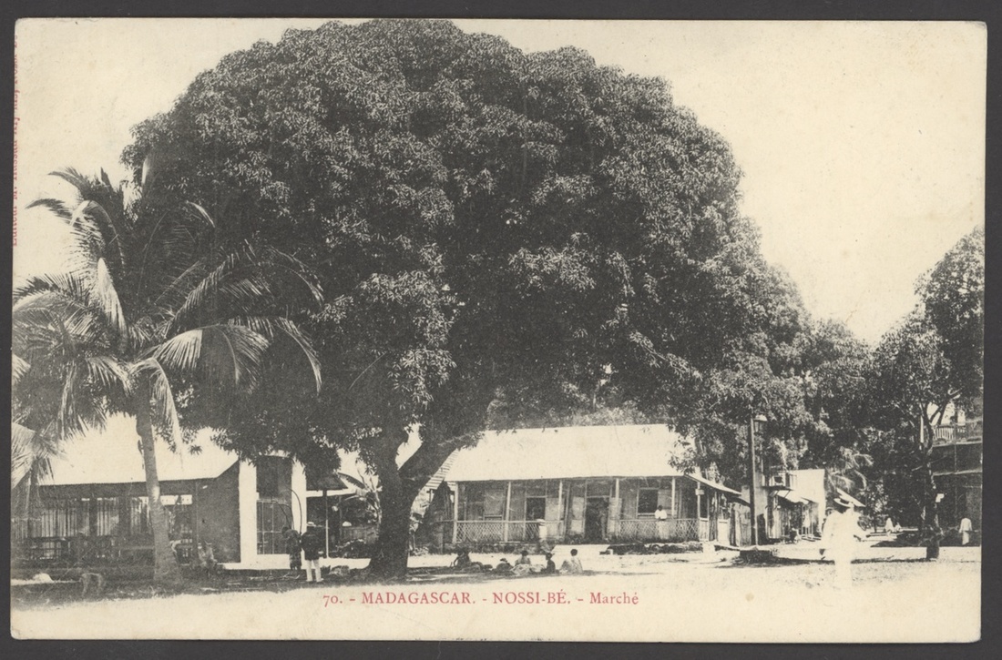 1908 (1 Dec.) p.p.c. (Nossi Be - Marché) to Tonkin franked 5c. with blue 41/Madagascar cancellation of Ambanja, Hanoi arrival on the front, fine