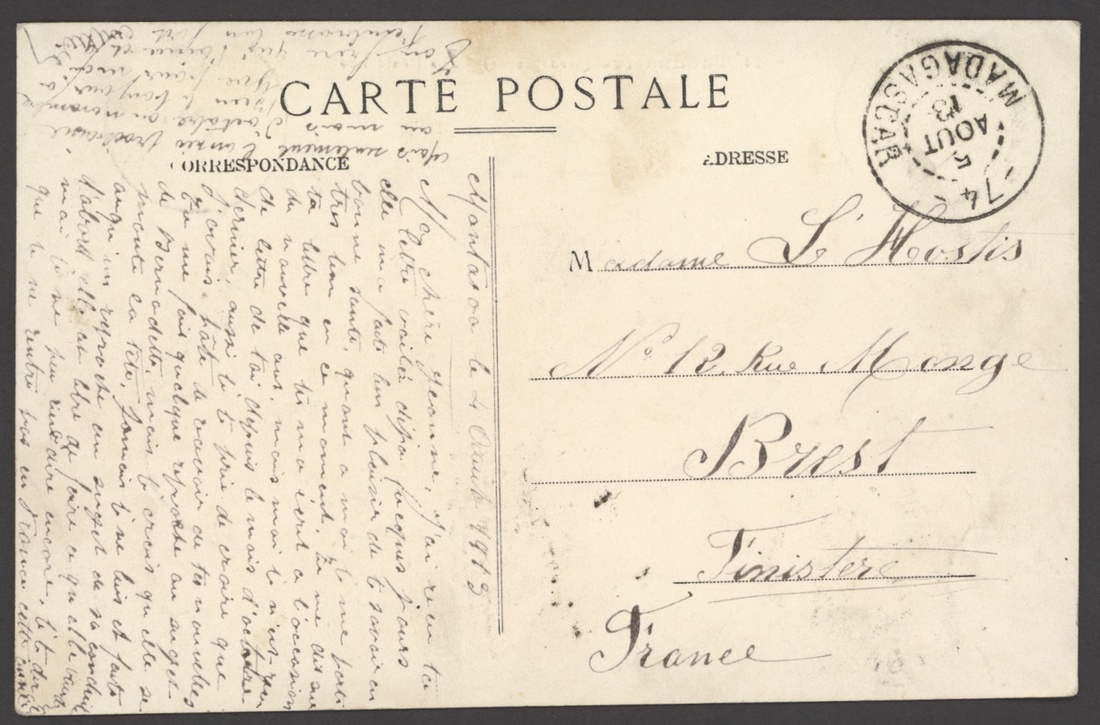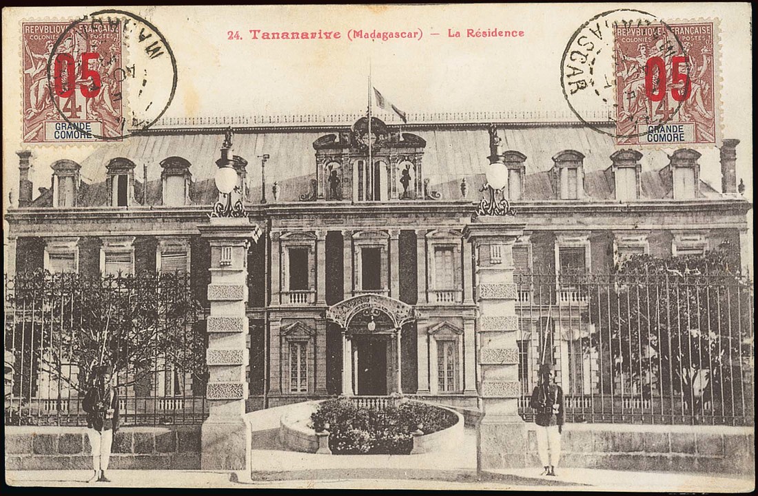 1913 (5 Aug.) p.p.c. (Tananarive (Madagascar) - Le Residence) to Finistere, franked Grand Comore 1912 "05" on 4c. (2) on the picture side, 74/Madagascar cancellation of Mantosa; fine