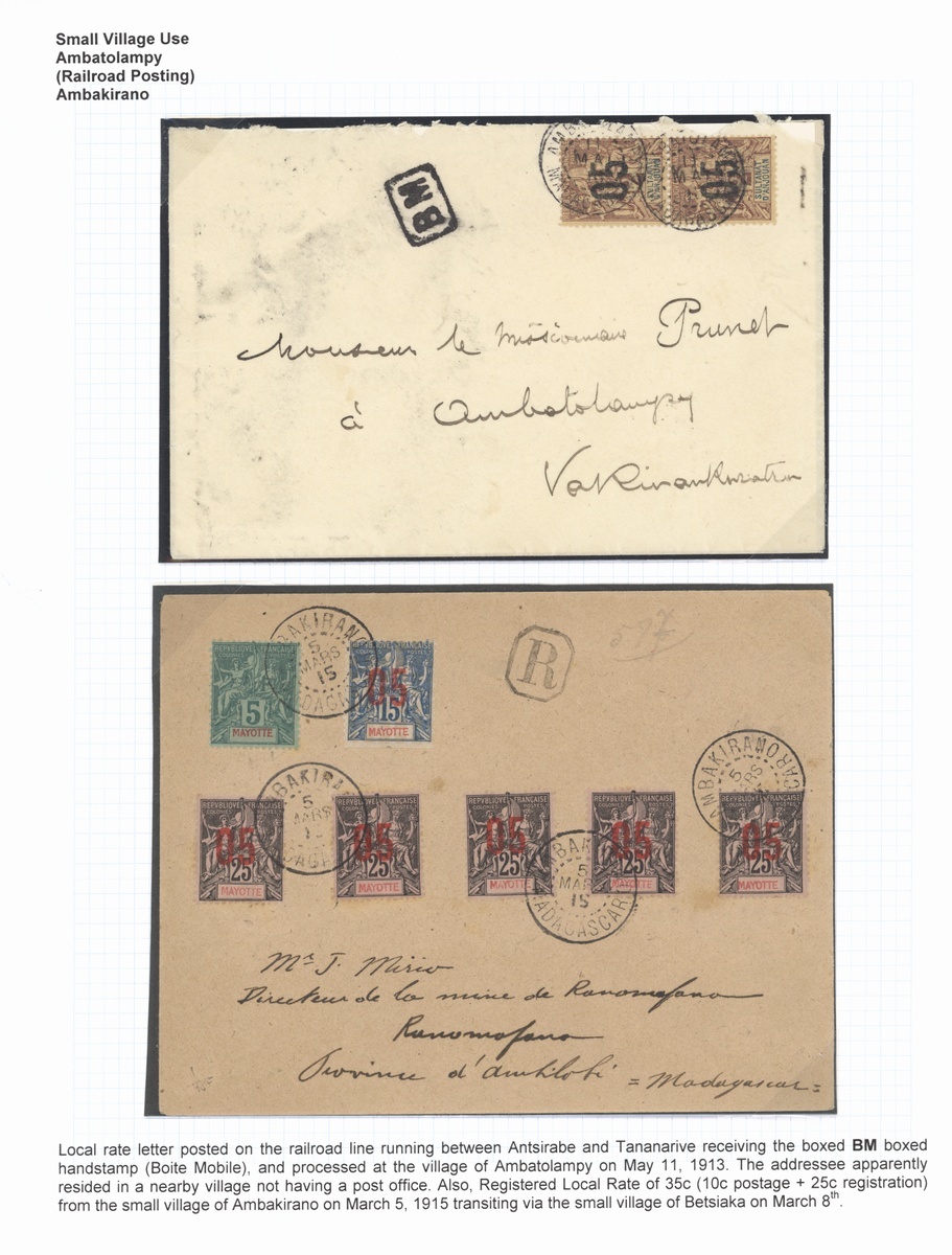 Ambakirano: 1913 (11 May) envelope to Ambatolampy franked Anjouan 1912 "05" on 2c. pair, Ambarkirano/Madagascar dotted circle cancellations with framed "