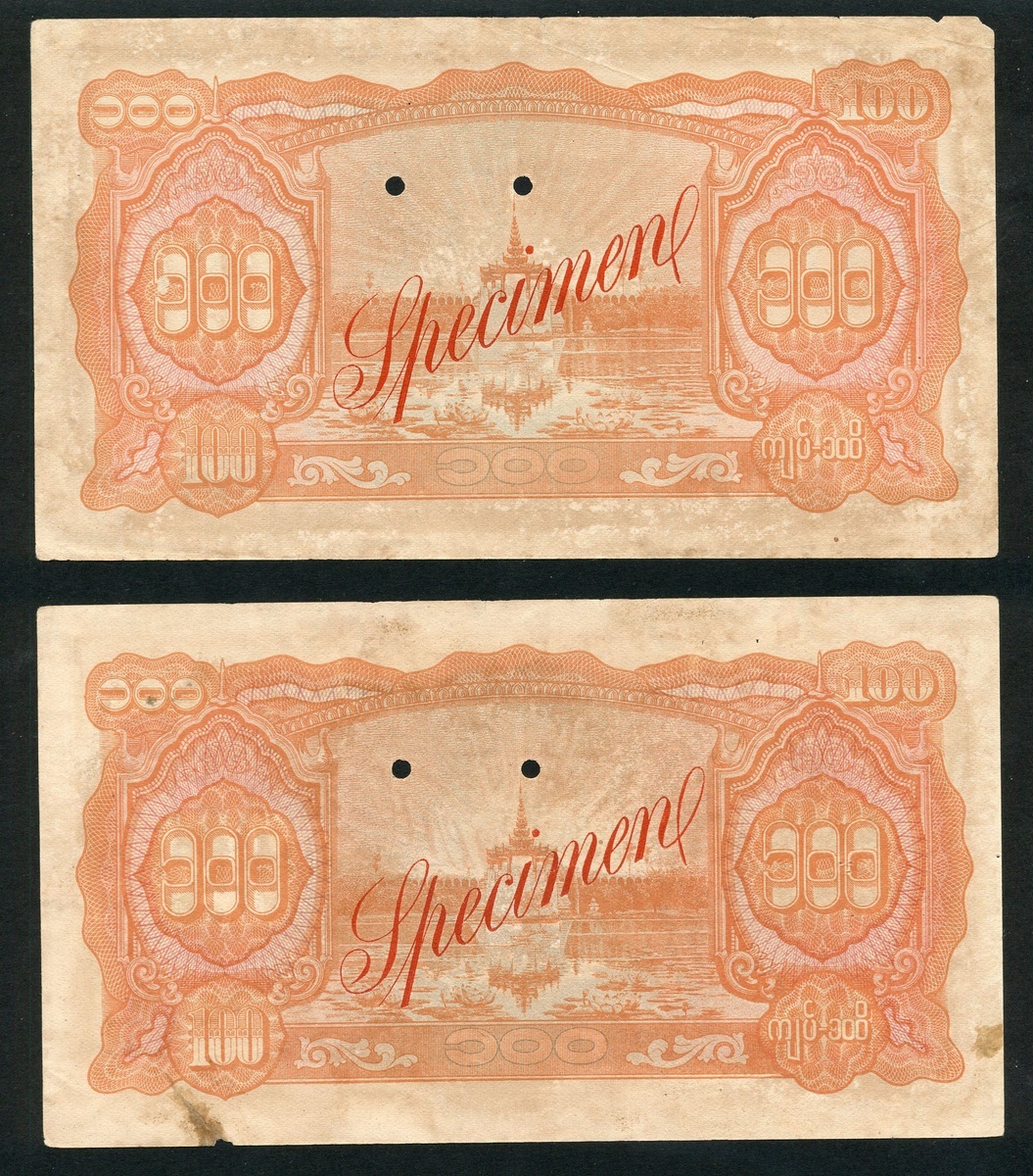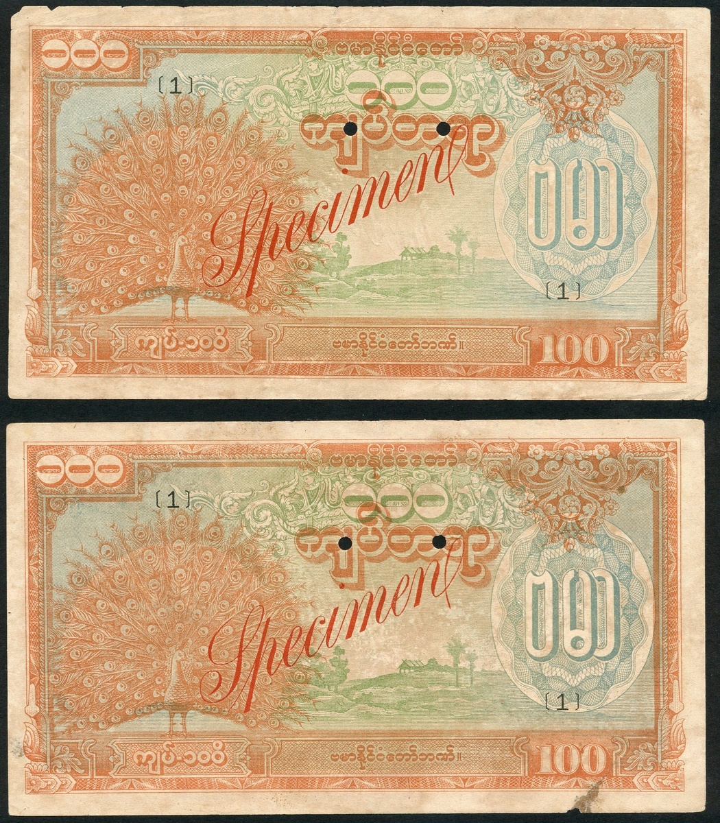 Burma State Bank, specimen 100 kyats (2), ND (1944), orange, blue and green, peacock at left, hole punched, diagonal red specimen overprint,