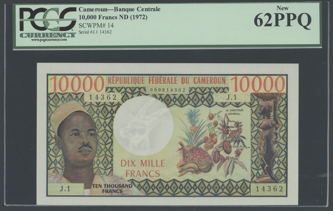 Republique Federale du Cameroun, 10000 francs, ND (1972), serial number J.1 14362, (Pick 14, TBB B308a), in PCGS Currency holder 62PPQ New