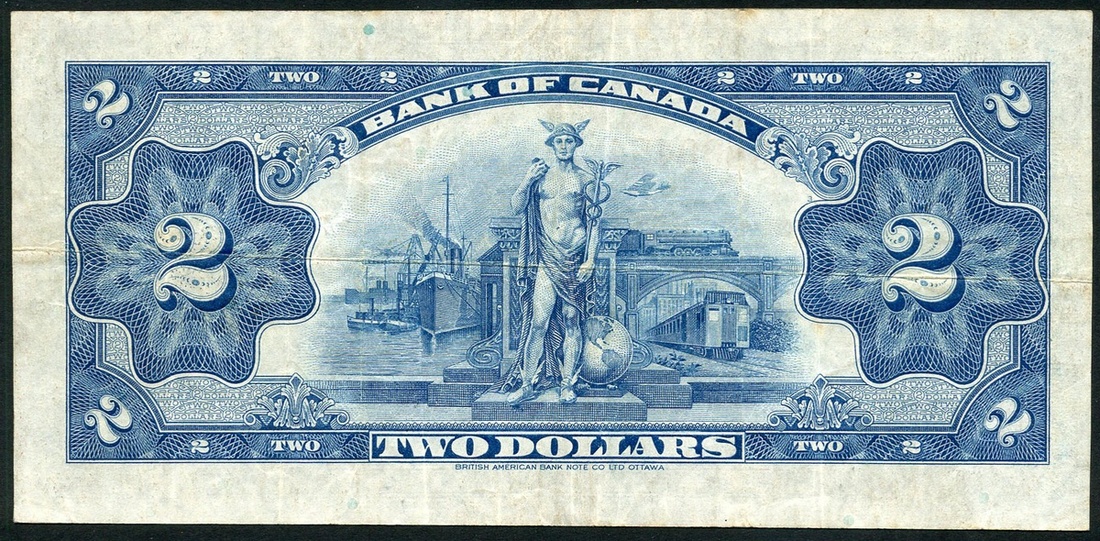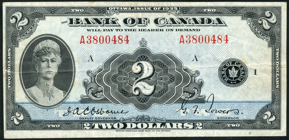 (x) Bank of Canada, $2, 1935, serial number A3800484, black on blue, Queen Mary at left, black seal at right, reverse, blue, Mercury,