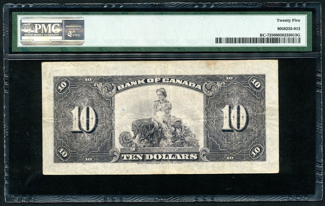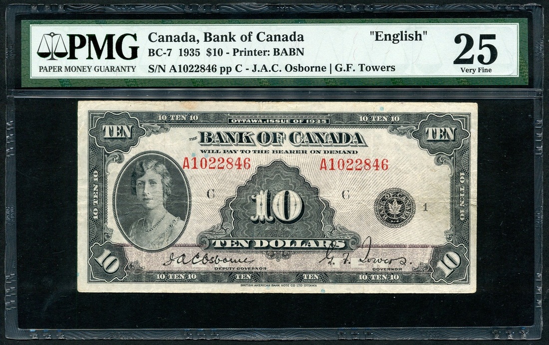 (x) Bank of Canada, $10, 1935, serial number A1022846, black on purple, Princess Mary at left, black seal at right, reverse, allegorical figure representing harvest seated at centre,