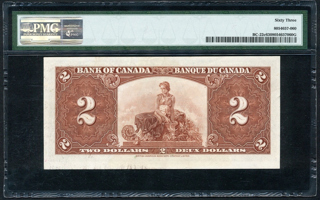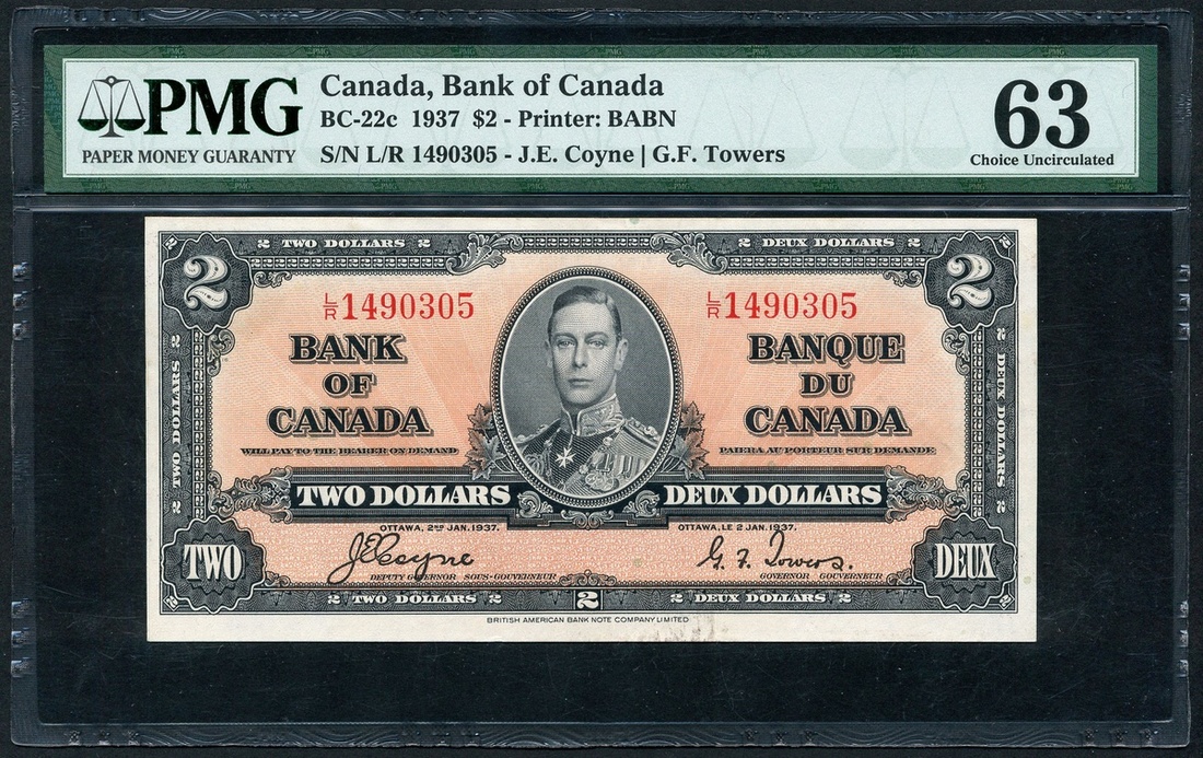 (x) Bank of Canada, $1, Ottawa, 2 January 1937, serial number L/R 1490305, (Pick 59c, TBB B322c), in PMG holder 63 Choice Uncirculated
