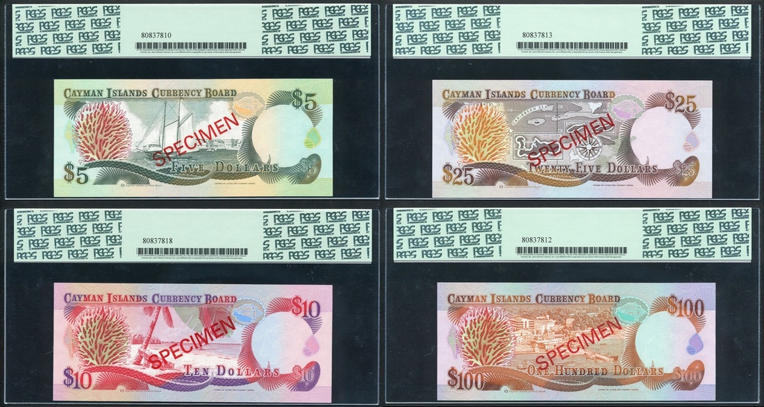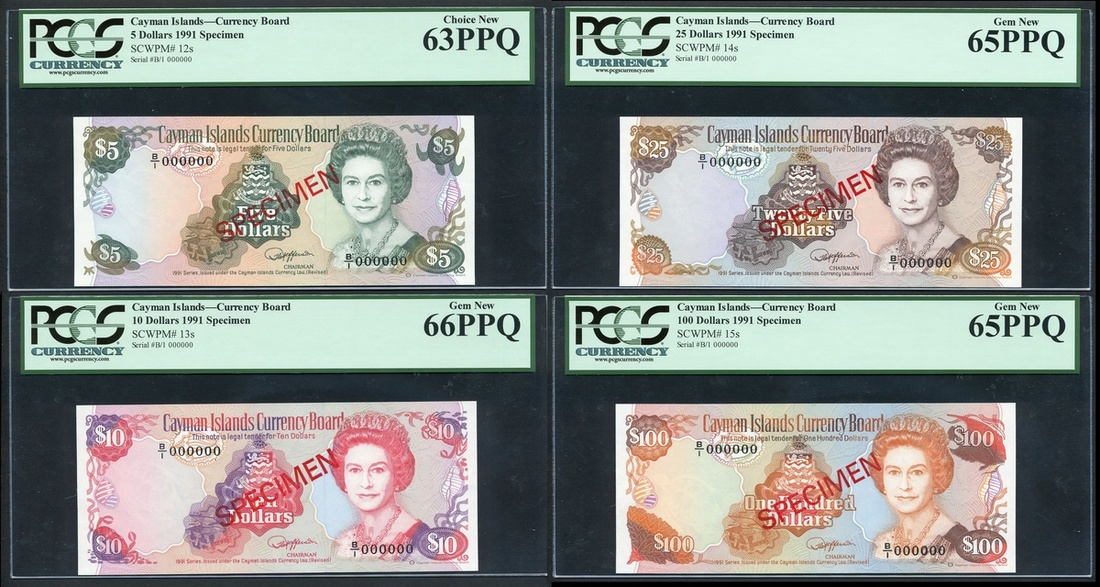 Cayman Islands Currency Board, complete specimen set of 1991 issues, $5, $10, $25, $100, serial number B/1 000000, (TBB B112-115, Pick 12s-15s), n PCGS Currency holders 63PPQ Choice New, 66PPQ Gem New and 65PPQ Gem New (x2) respectively (4)
