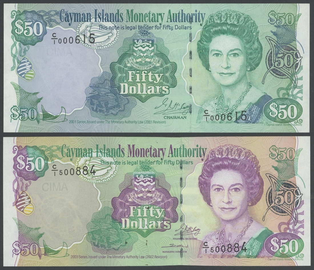 Cayman Islands Monetary Authority, $50 (2), 2001, 2003, serial number C/1 500884, C/1 000615, (TBB B209, B212, Pick 29, 32), signs of handling, generally about uncirculated (2)