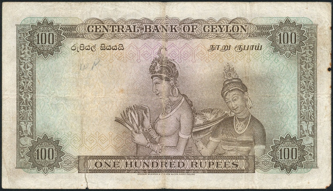 Central Bank of Ceylon, 100 rupees, 16 October 1954, serial number V/22 59906, (Pick 53b, TBB B309b), tear at lower right margin, rust damage at left, about fine