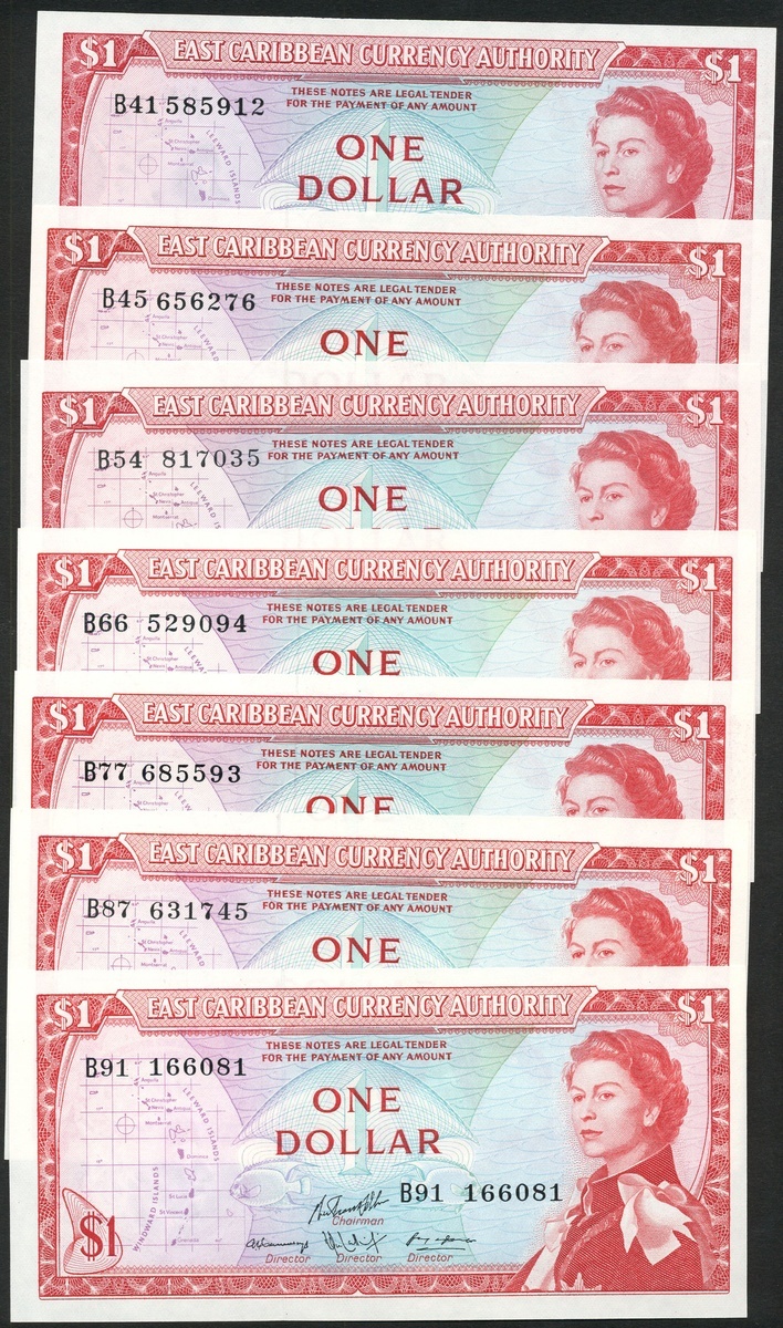 East Caribbean Currency Authority, $1 (8), 1965, prefixes B41, B45, B54, B66, B77, B87, B91, (TBB B101b6, B101b7, B101b9, B101b10, Pick 13d (2), 13e, 13f (3)), about uncirculated to uncirculated and original (8)