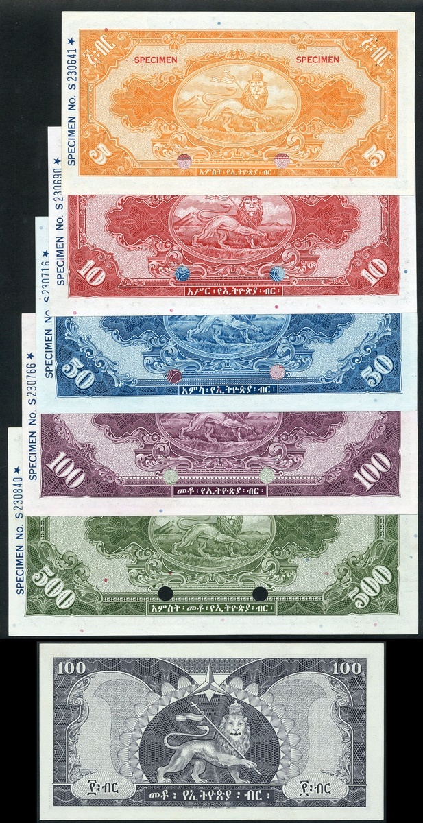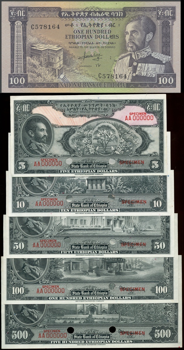 State Bank of Ethiopia, a specimen set of the issue of 1945, all with red serial number AA 000000, comprising $5, 10, 50, 100 and $500,