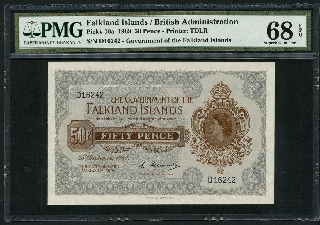 (x) Government of the Falkland Islands, 50 pence, 25 September 1969, serial number D 16242, (TBB B215, Pick 10a), in PMG holder 68 EPQ Superb Gem Uncirculated