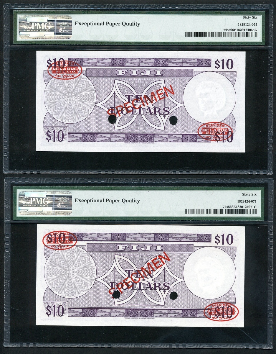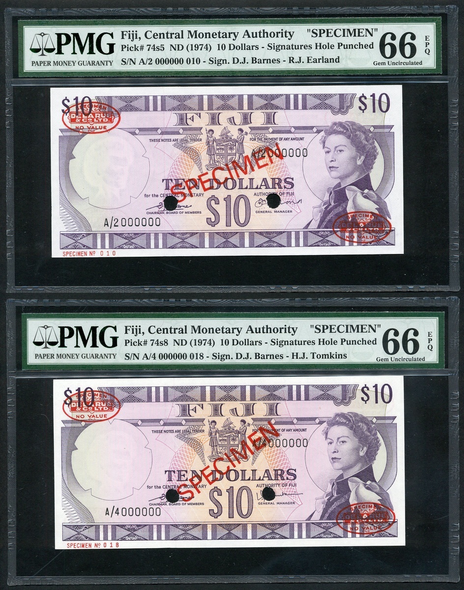 The Central Monetary Authority of Fiji, a pair of specimen $10, ND (1974), zero serial number, (Pick 74s5, 74s8, TBB B405bs, B405cs2), both in PMG holder 66 EPQ Gem Uncirculated (2)