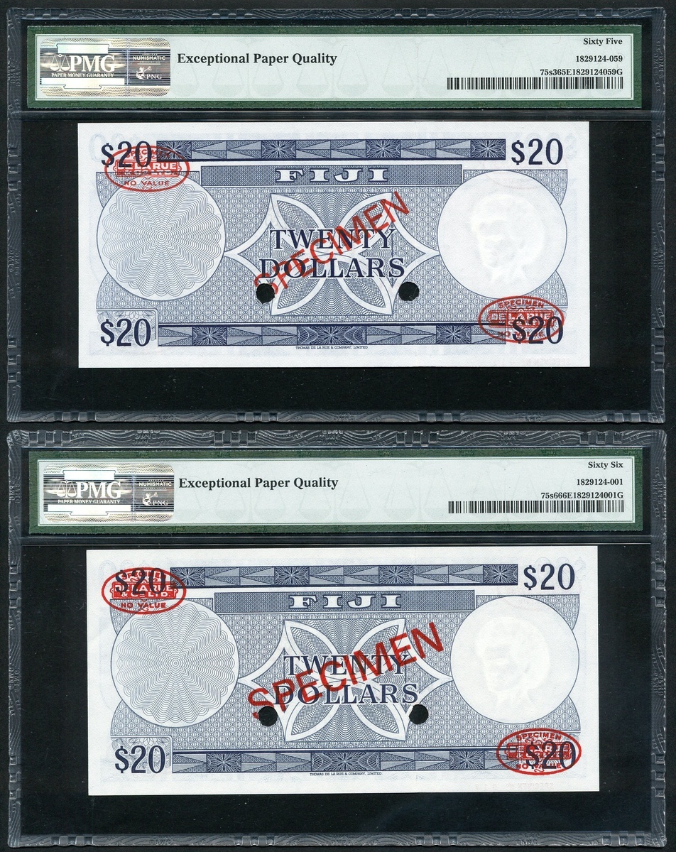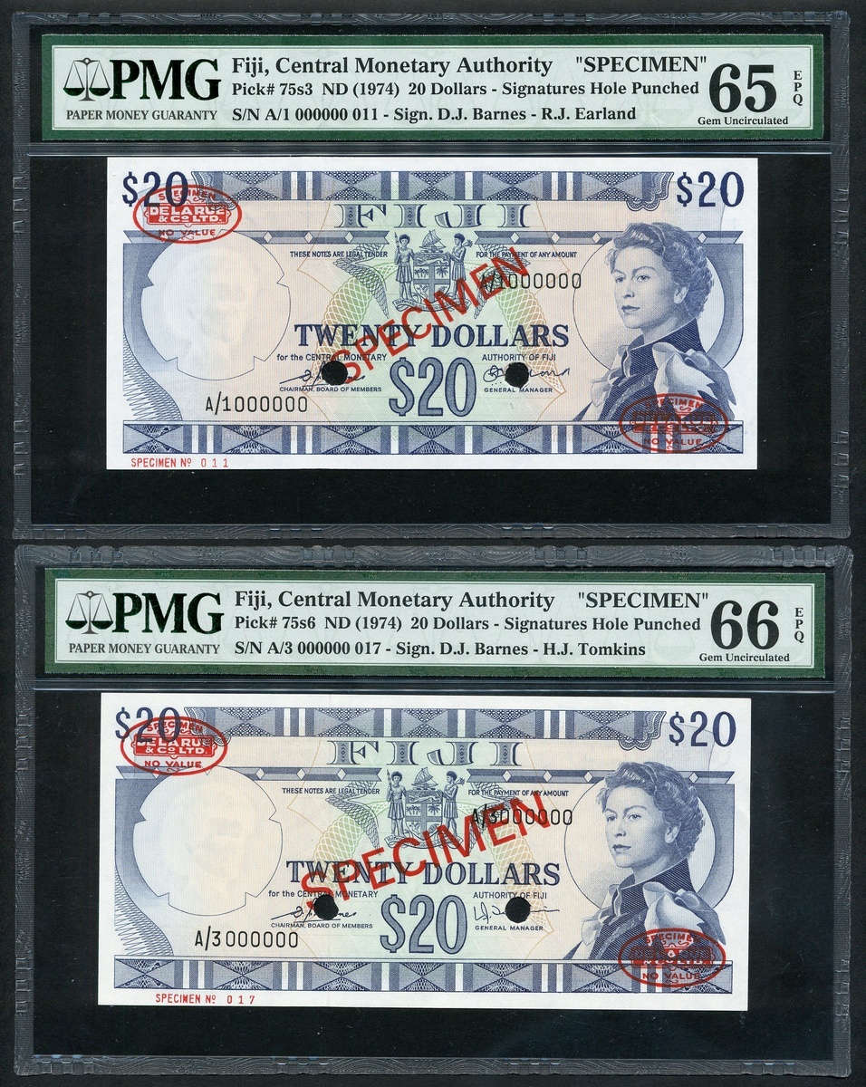 The Central Monetary Authority of Fiji, a pair of specimen $20, ND (1974), zero serial number, (Pick 75s3, 75s6, TBB B406as, B406cs), in PMG holder 65 EPQ and 66 EPQ Gem Uncirculated (2)
