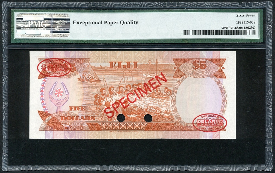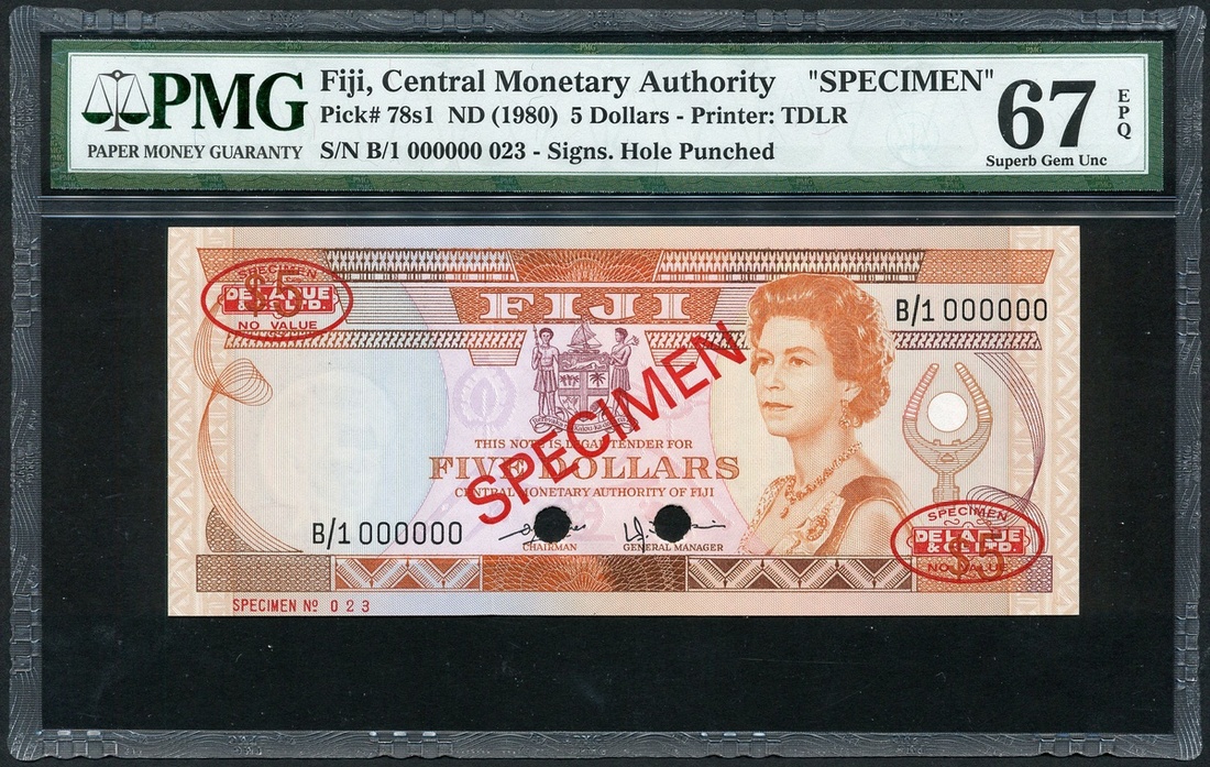 The Central Monetary Authority of Fiji, specimen $5, ND (1980), zero serial number, (Pick 78s1, TBB B409as), in PMG holder 67 EPQ Superb Gem Uncirculated (2)