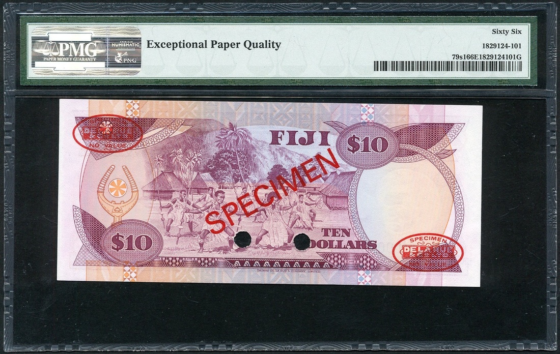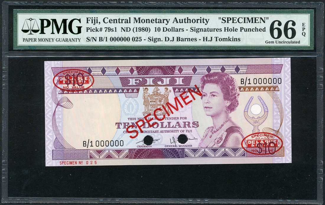 The Central Monetary Authority of Fiji, specimen $10, ND (1980), zero serial number, (Pick 79s1, TBB B410as), in PMG holder 66 EPQ Gem Uncirculated
