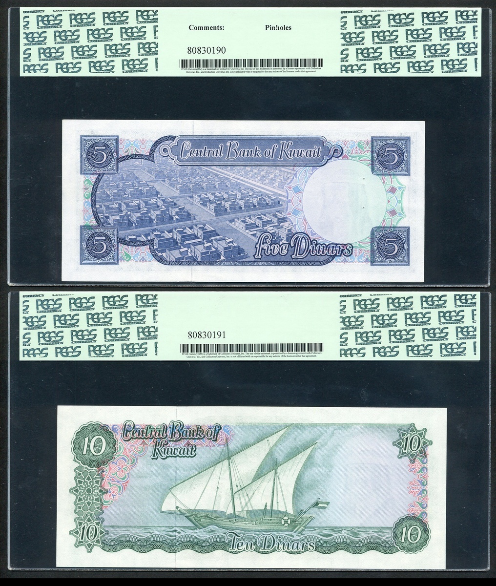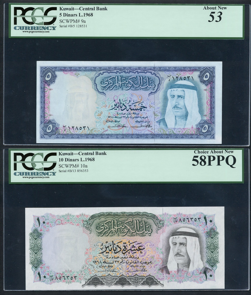 Central Bank of Kuwait, 5 and 10 dinars, ND (1970-1971), serial numbers B/5 128531 and B/13 856353, (Pick 9a, 10a, TBB B204a, B205a), in PCGS Currency holders 53 About New (Pinholes) and 58PPQ Choice About New (2)
