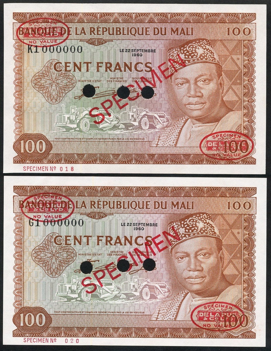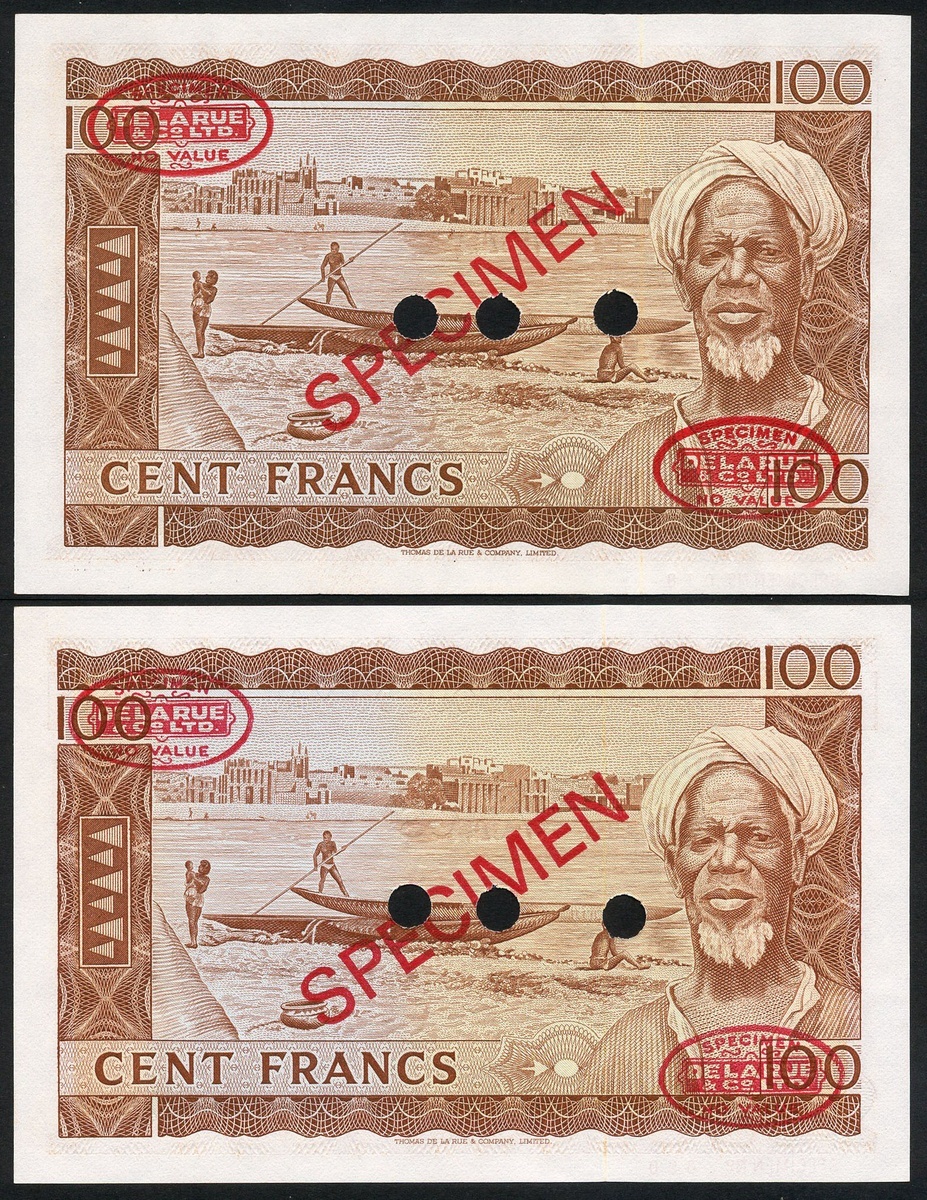 Banque De la Republique Du Mali, a pair of specimen 100 Francs, 22 September 1960, million serial number, (Pick 7s, TBB B107as1), uncirculated, perforated and with De La Rue specimen chop marks (2)