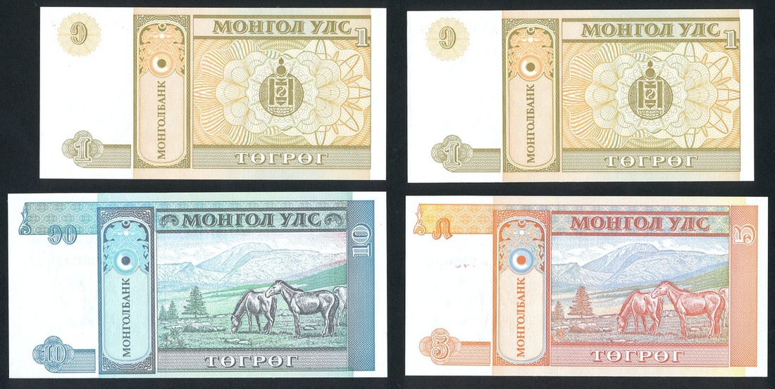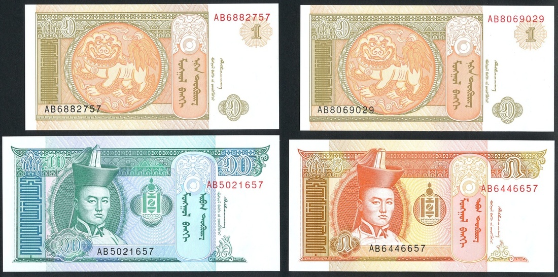 Mongol Bank, a group of 4x notes consisting of 1 (2), 5 and 10 Togrog, ND (1933), serial numbers (Pick 52-54, TBB B404a-B406a), uncirculated (4)