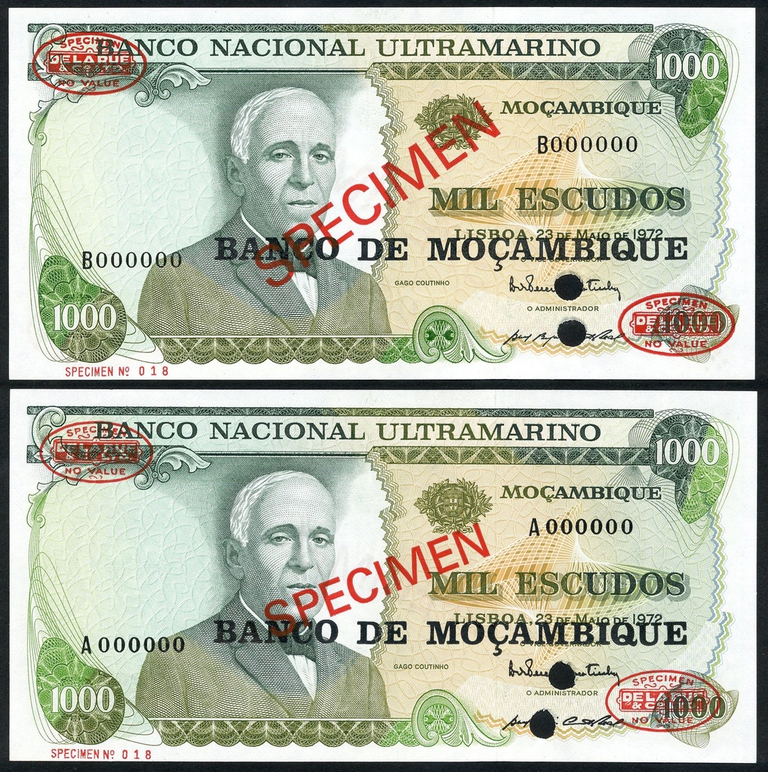 Banco Nacional Ultramarino, a pair of specimen 1000 Escudos, Mozambique, 23 May 1972, zero serial numbers, (Pick 115s), uncirculated, perforated and with De La Rue specimen chop marks (2)