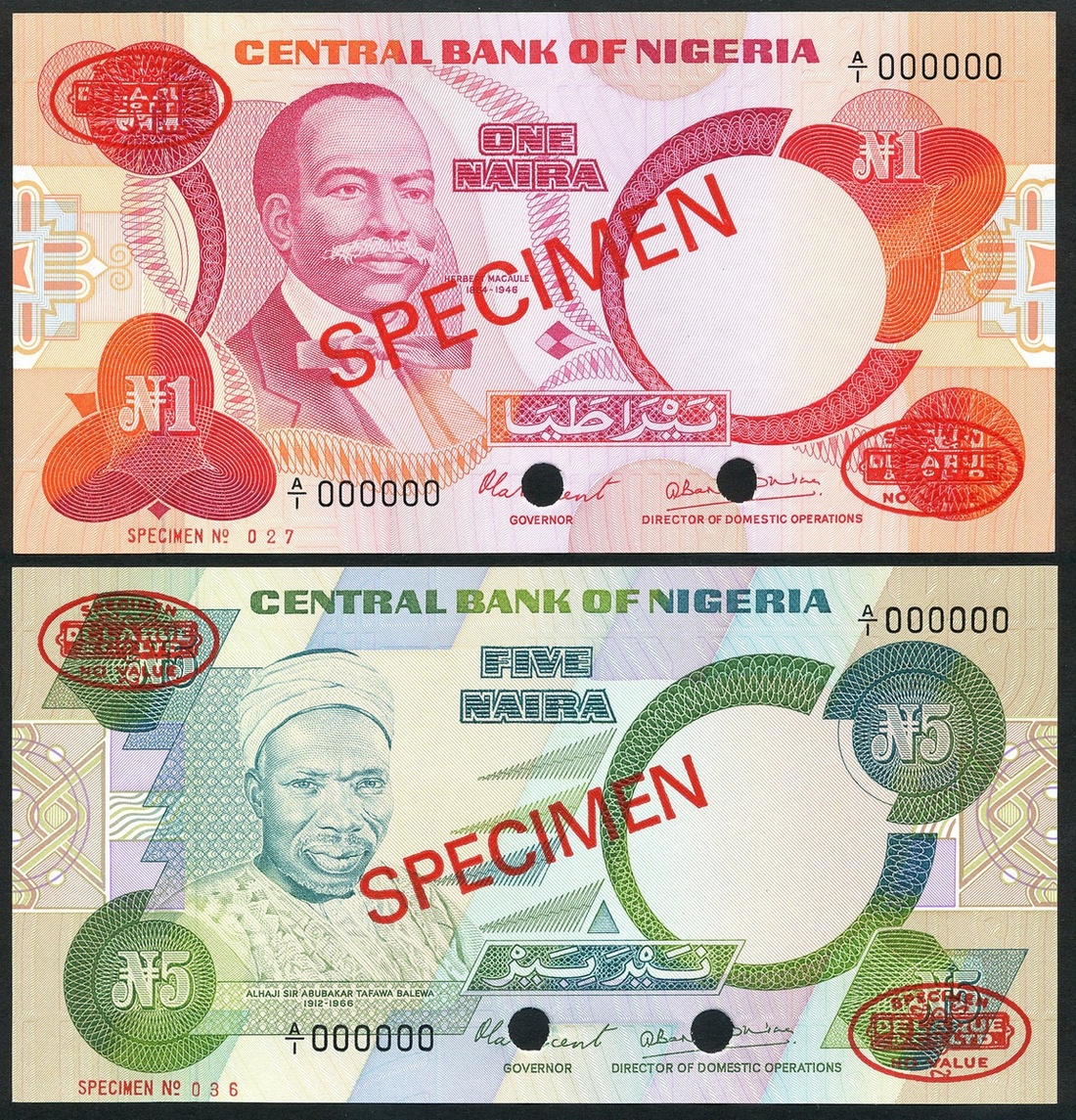 Central Bank of Nigeria, a pair of specimen 1 and 5 Naira, ND (1979-84), zero serial numbers, speicmen numbers 027 and 036,