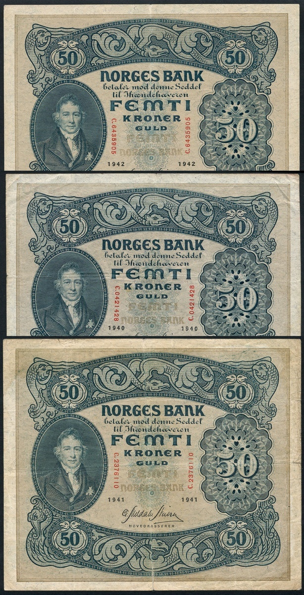 Norges Bank, Norway, 50 kroner, 1940, 1941, 1942, (Pick 9d), 1942 note extremely fine, others good fine to very fine (3)