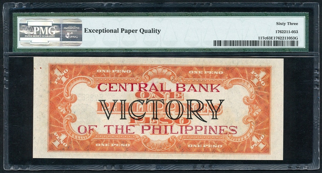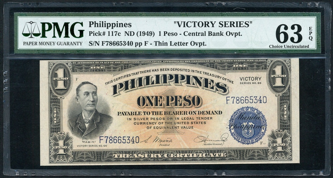 (x) Philippines, Central Bank of the Philippines overprint on 1 Peso, ND (1949), serial number F78665340, (Pick 117c), in PMG holder 63 EPQ Choice Uncirculated