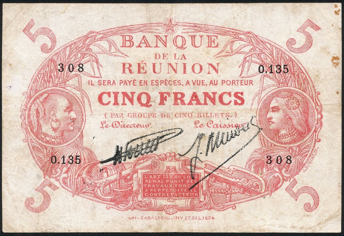 Banque de la Reunion, 5 francs, 1901 (ND 1912-1944), serial number O.125 308, (Pick 14), about very fine, stains and crossfold, rare