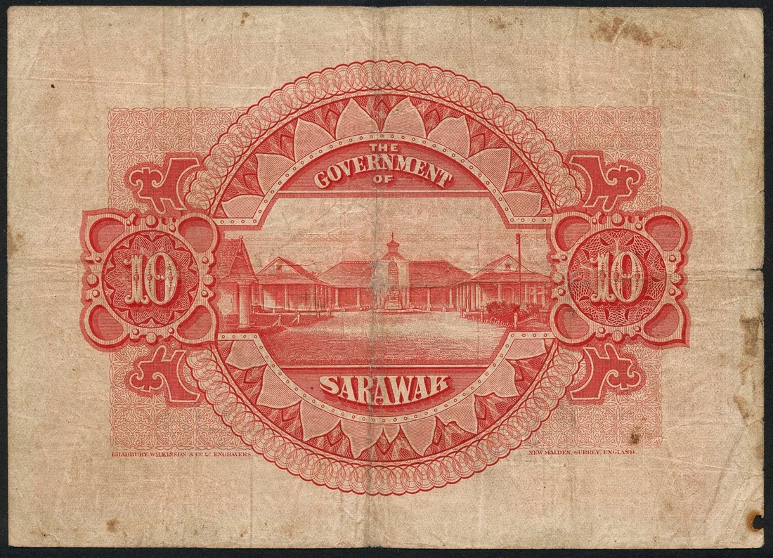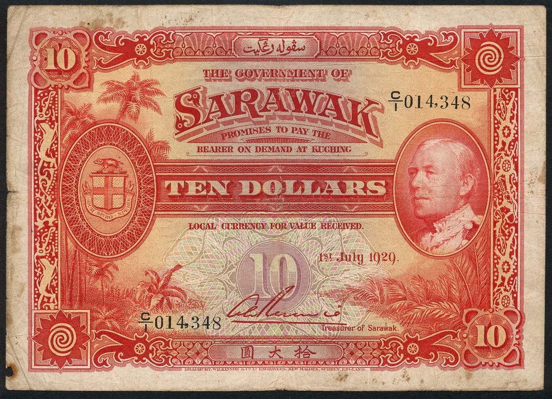 The Government of Sarawak, $10, 1 July 1929, serial number C/1 014348, (Pick 16), very fine, light toning and stains, small tears and hole at lower left corner